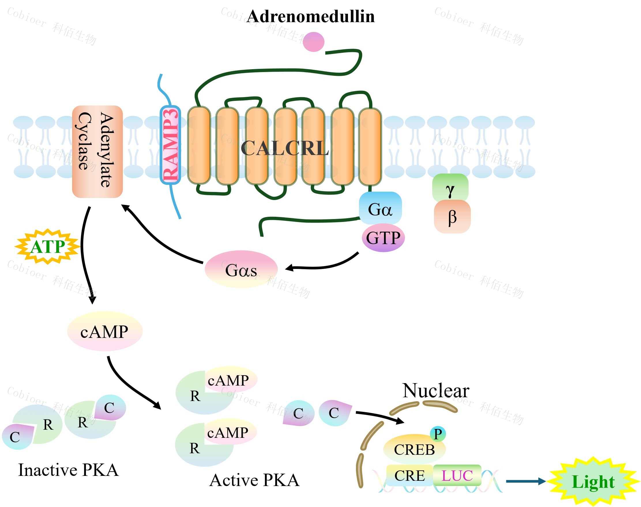 | 降鈣素基因相關(guān)肽(CGRP)家族包括 CGRP 本身、降鈣素(CT)、腎上腺髓質(zhì)素 (AM)和胰島淀粉樣肽(AMY)。 Adrenomedullin 2(AM2),亦稱中間腎上腺髓質(zhì)素,是一種由 52 個(gè)氨基酸構(gòu)成的多 肽激素,廣泛表達(dá)于心血管、腎臟及脂肪等組織,作為一種強(qiáng)效的血管舒張因子,在調(diào)節(jié) 血壓、體液平衡及抑制炎癥反應(yīng)中發(fā)揮著關(guān)鍵作用。CALCRL(也稱為 CLR 或 CRLR)是 核心的 G 蛋白偶聯(lián)受體單元,但自身無功能性;RAMP3 作為必需的伴侶蛋白,不僅協(xié)助 CALCRL 轉(zhuǎn)運(yùn)至細(xì)胞膜,更決定了該復(fù)合物特異性地識別并高親和結(jié)合 AM2,從而形成完 整的腎上腺髓質(zhì)素 2 型受體。 配體結(jié)合后,復(fù)合物與 G 蛋白相互作用,Gαs 亞基從復(fù)合物中分離并激活腺苷酸環(huán)化 酶,產(chǎn)生 cAMP。細(xì)胞內(nèi) cAMP 濃度升高刺激 cAMP 依賴的信號通路,最終導(dǎo)致轉(zhuǎn)錄因子 cAMP 應(yīng)答元件結(jié)合蛋白(CREB)與 CRE 啟動(dòng)子結(jié)合,誘導(dǎo)基因表達(dá)。 |