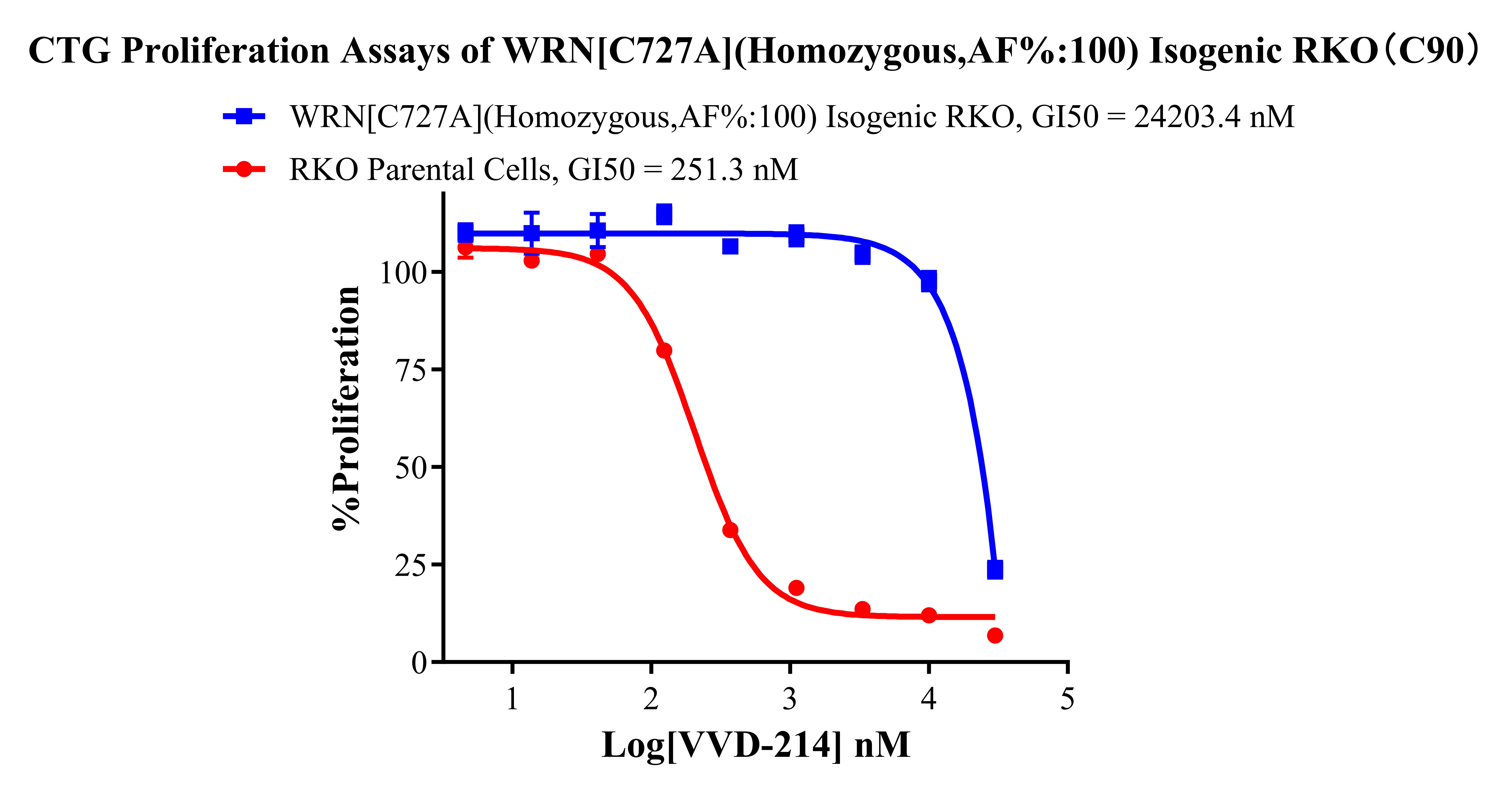 WRN[C727A](Homozygous,AF%:100) Isogenic RKO 藥靶細胞,通過基因 編輯的方式將 WRN 的 727 位氨基酸胱氨酸(C)突變?yōu)楸彼幔ˋ)。![]() Figure 1. WRN[C727A](Homozygous,AF%:100) Isogenic RKO 原理示意圖 |