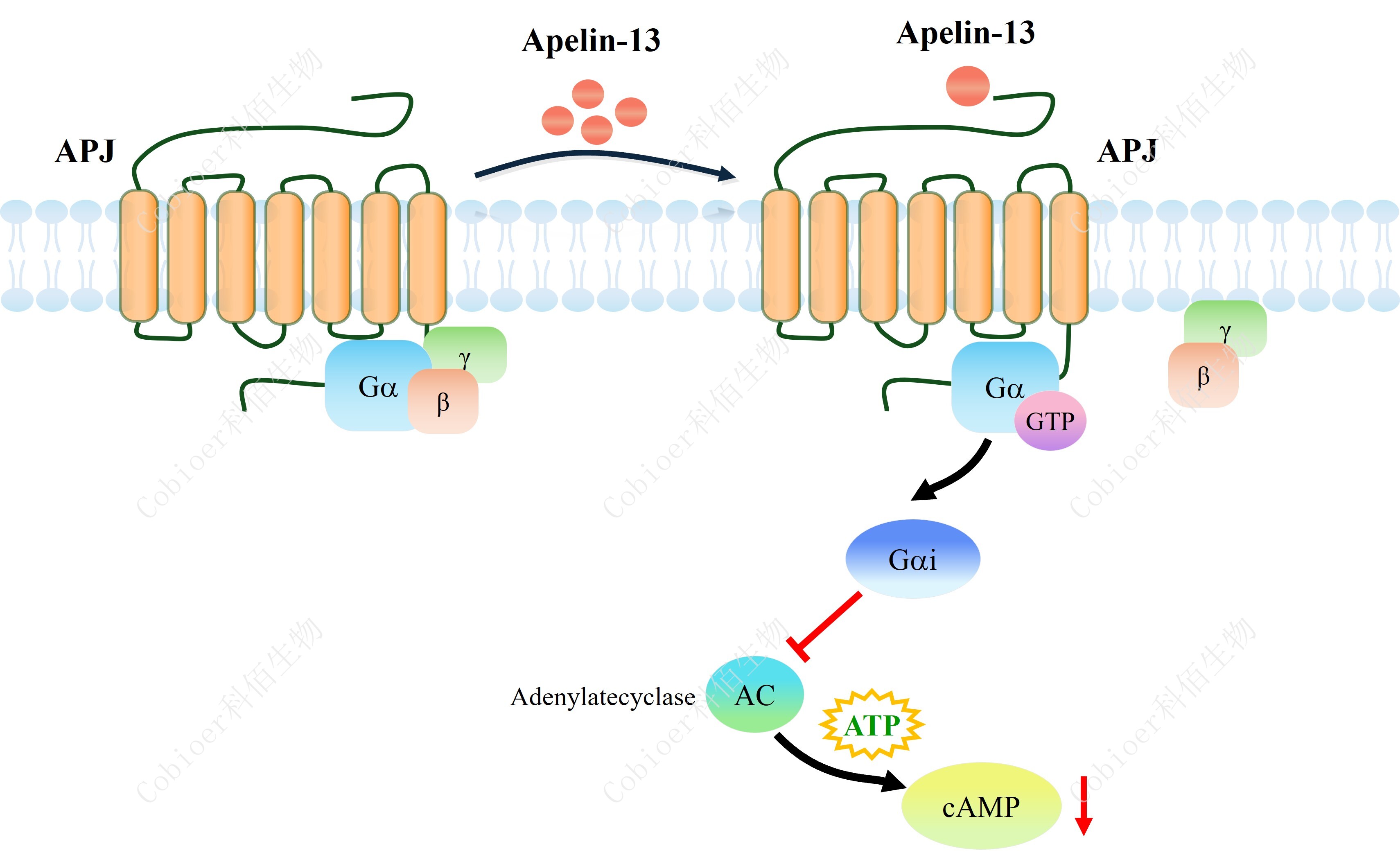 cAMP 在 G 蛋白偶聯(lián)受體(GPCR)信號轉(zhuǎn)導(dǎo)中是一種關(guān)鍵的第二信使。當配體結(jié)合到 GPCR,構(gòu)象發(fā)生變化,激活受體接著激活G蛋白,Gi的激活導(dǎo)致腺苷酸環(huán)化酶調(diào)控 cAMP 的下調(diào)。APLNR(APJ)藥靶模型很好的模擬了體內(nèi) APLNR(APJ)的信號轉(zhuǎn)導(dǎo)過程,原 理見下圖所示。 ![]() Figure 1. APLNR(APJ) CHO 細胞模型原理圖