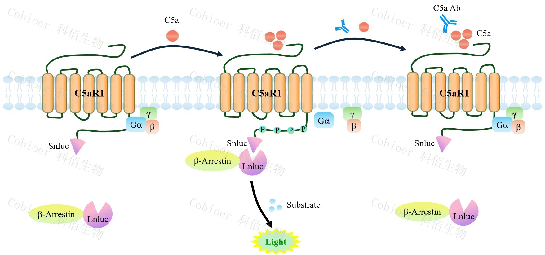 C5aR1 β-Arrestin CHO 報告基因藥靶模型很好的模擬了體內(nèi) C5aR1/β-Arrestin 的信號轉(zhuǎn)導過程,原理見下圖所示。![]() Figure 1. C5aR1 β-Arrestin CHO 細胞模型原理圖 |