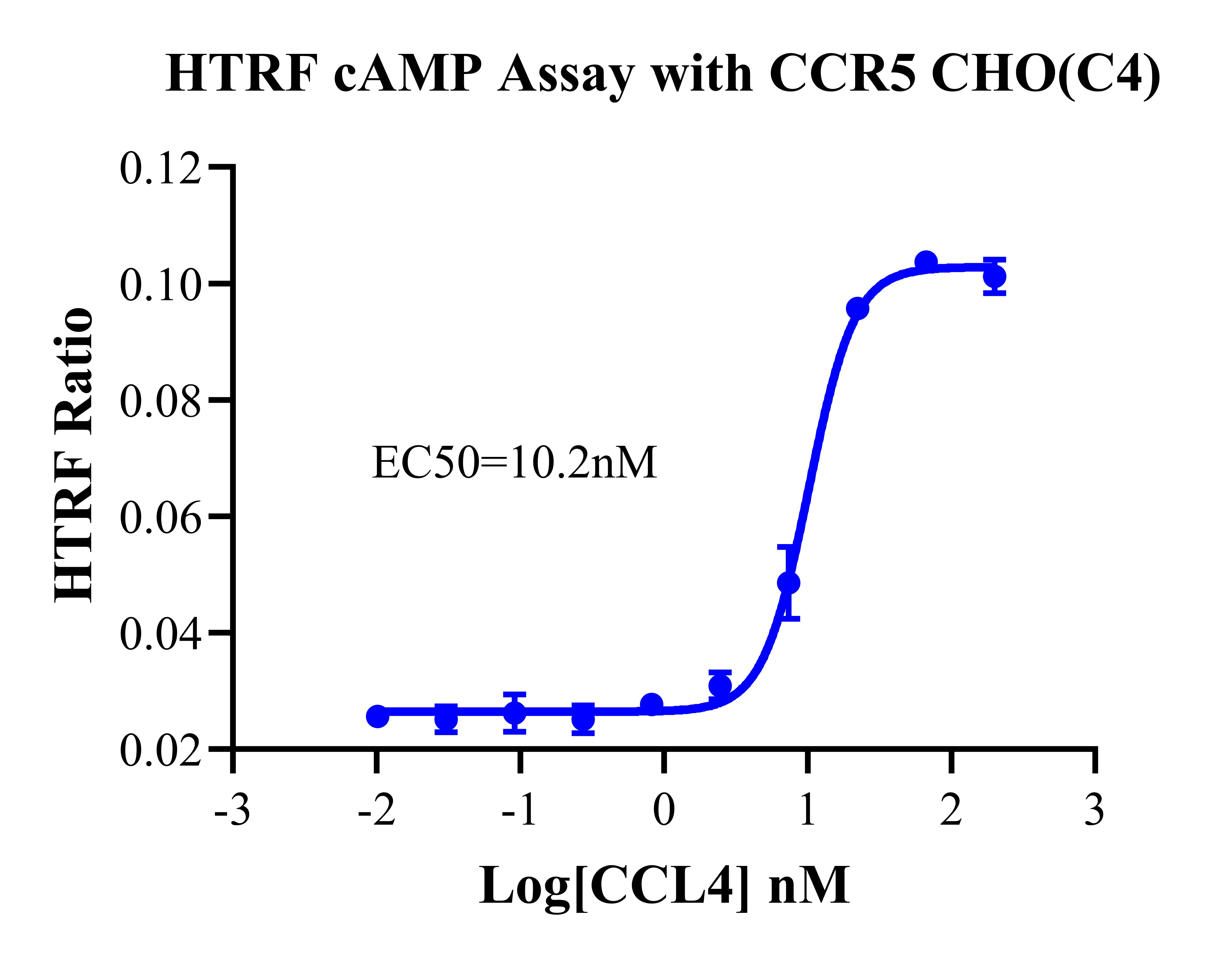 cAMP 在 G 蛋白偶聯(lián)受體(GPCR)信號(hào)轉(zhuǎn)導(dǎo)中是一種關(guān)鍵的第二信使。當(dāng)配體結(jié)合到 GPCR,構(gòu)象發(fā)生變化,激活受體接著激活G蛋白,Gi的激活導(dǎo)致腺苷酸環(huán)化酶調(diào)控 cAMP 的下調(diào)。CCR5 藥靶模型很好的模擬了體內(nèi) CCR5 的信號(hào)轉(zhuǎn)導(dǎo)過程,原理見下圖所示。![]() Figure 1. CCR5 CHO 細(xì)胞模型原理圖