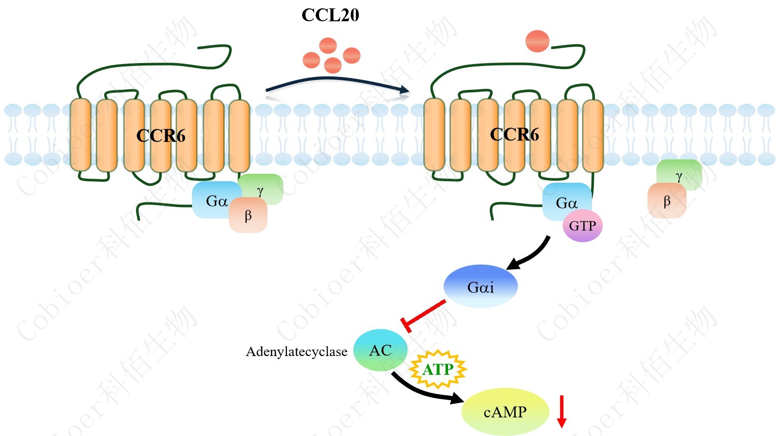 cAMP 在 G 蛋白偶聯(lián)受體(GPCR)信號轉(zhuǎn)導中是一種關鍵的第二信使。當配體結(jié)合到 GPCR,構(gòu)象發(fā)生變化,激活受體接著激活 G 蛋白,Gi 的激活導致腺苷酸環(huán)化酶調(diào)控 cAMP 的下調(diào)。CCR6 藥靶模型很好的模擬了體內(nèi) CCR6 的信號轉(zhuǎn)導過程,原理見下圖所示。![]() Figure 1. CCR6 CHO 細胞模型原理圖 |