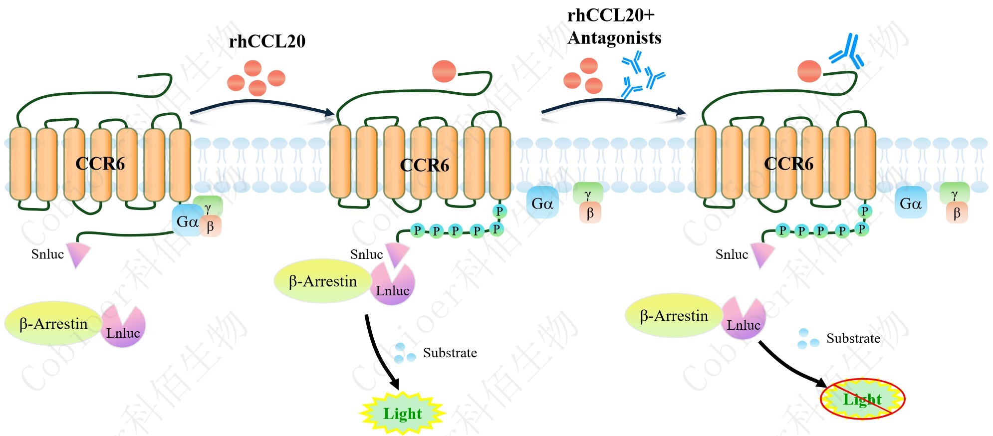 CCR6 β-Arrestin CHO 報(bào)告基因藥靶模型很好的模擬了體內(nèi) CCR6/β-Arrestin 的信號(hào)轉(zhuǎn) 導(dǎo)過(guò)程,原理見下圖所示。![]() Figure 1. CCR6 β-Arrestin CHO 細(xì)胞模型原理圖 |
