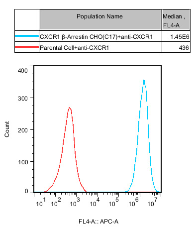 CXCR1 β-Arrestin CHO 報(bào)告基因藥靶模型很好的模擬了體內(nèi) CXCR1/β-Arrestin 的信號(hào)轉(zhuǎn)導(dǎo)過(guò)程,原理見(jiàn)下圖所示。當(dāng)缺乏配體刺激時(shí),β-Arrestin 不與 CXCR1 結(jié)合,融合β- Arrestin 的熒光素酶處于失活構(gòu)象,當(dāng) CXCR1 遭遇配體刺激時(shí),融合熒光素酶報(bào)告基因的 β-Arrestin 被招募,使熒光素酶報(bào)告基因處于激活狀態(tài),加入其底物后發(fā)光信號(hào)增強(qiáng)。![]() Figure 1. CXCR1 β-Arrestin CHO 細(xì)胞模型原理圖 |