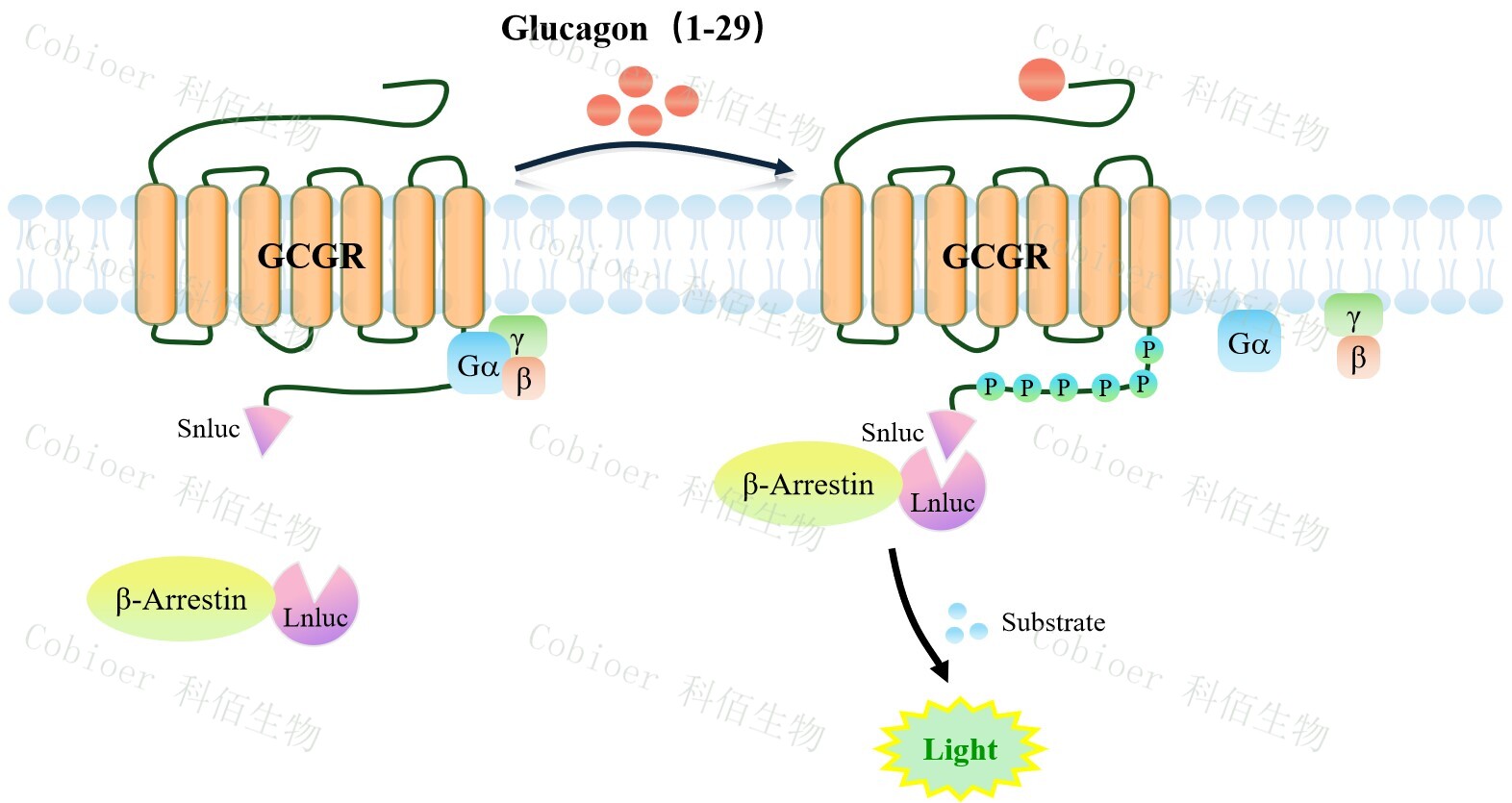 GCGR β-Arrestin CHO 報告基因藥靶模型很好的模擬了體內(nèi) GCGR/β-Arrestin 的信號轉(zhuǎn) 導(dǎo)過程,原理見下圖所示。當(dāng)缺乏配體刺激時,β-Arrestin 不與 GCGR 結(jié)合,融合β- Arrestin 的熒光素酶處于失活構(gòu)象;當(dāng) GCGR 遭遇配體刺激時,融合熒光素酶報告基因的β- Arrestin 被招募,使熒光素酶報告基因處于激活狀態(tài),加入其底物后發(fā)光信號增強。![]() Figure 1. GCGR β-Arrestin CHO 細胞模型原理圖 |