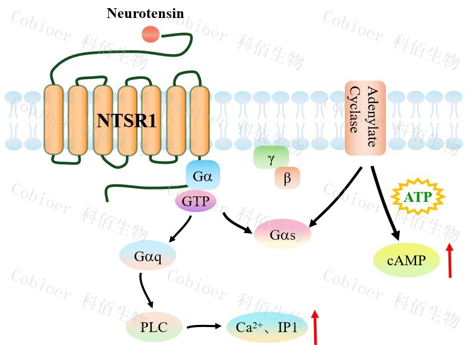 | cAMP 在 G 蛋白偶聯(lián)受體(GPCR)信號(hào)轉(zhuǎn)導(dǎo)中是一種關(guān)鍵的第二信使。當(dāng)配體結(jié)合 到 GPCR,構(gòu)象發(fā)生變化,激活受體接著激活 G 蛋白,Gs 的激活導(dǎo)致腺苷酸環(huán)化酶調(diào)控 cAMP 的升高。 NTSR1 還可以通過(guò) Gq 蛋白的信號(hào)通路,調(diào)控 IP1 的升高。NTSR1 與配體結(jié)合,導(dǎo)致 Gαq 亞基的激活,觸發(fā) PLC-γ,從而產(chǎn)生兩個(gè)第二信使:IP3 和 DAG,它們參與細(xì)胞內(nèi)鈣 動(dòng)員。由于 IP3 在代謝上不穩(wěn)定,因此測(cè)量通路激活的替代標(biāo)志物 IP1 作為檢測(cè)標(biāo)準(zhǔn)。 NTSR1 CHO 細(xì)胞藥靶模型很好的模擬了體內(nèi) NTSR1 的信號(hào)轉(zhuǎn)導(dǎo)過(guò)程,原理見下圖所示。 ![]() Figure 1. NTSR1 CHO 細(xì)胞模型原理圖 |
