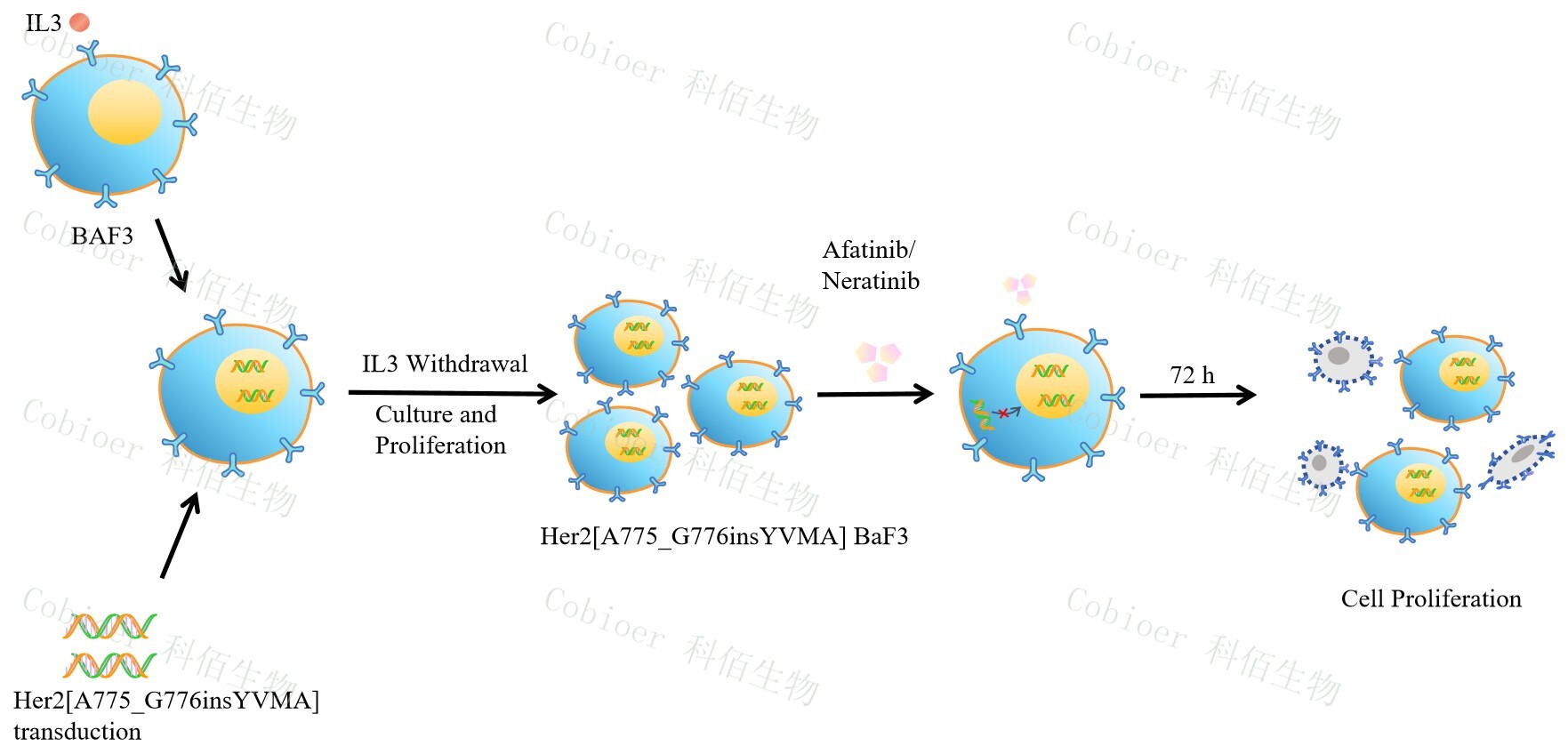 HER2[A775_G776insYVMA] BaF3 藥靶細(xì)胞,通過轉(zhuǎn)導(dǎo)突變狀態(tài)的 HER2[A775_G776insYVMA] 基 因 到 BaF3 細(xì) 胞 系 中 , 穩(wěn) 定 表 達(dá)人突變形態(tài)下的 HER2[A775_G776insYVMA] 基因。