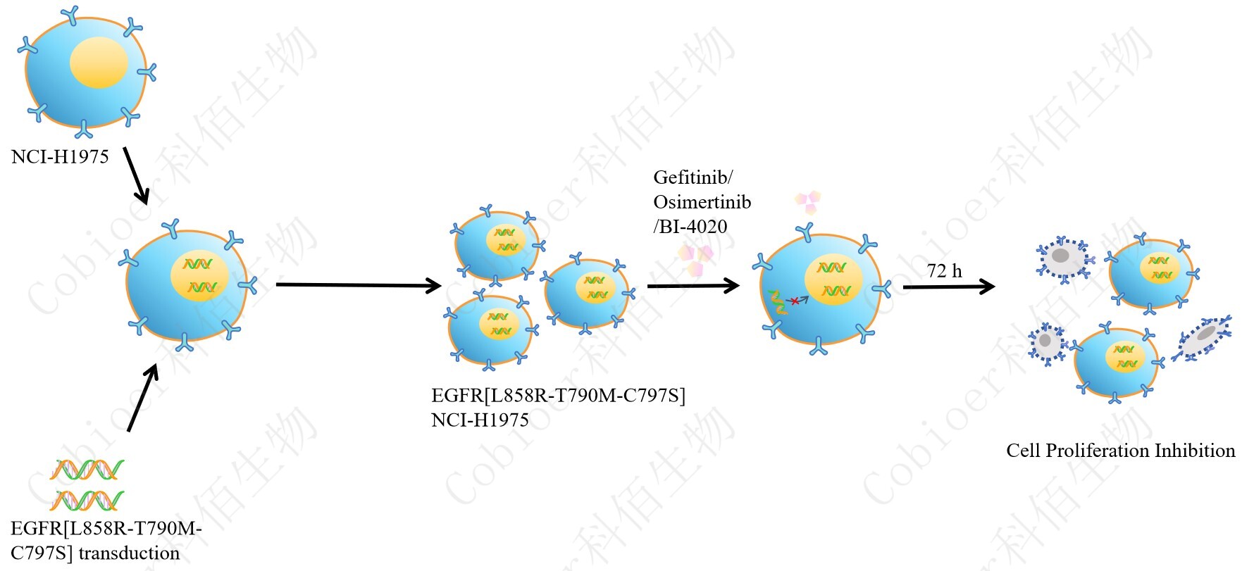 EGFR[L858R-T790M-C797S] NCI-H1975 藥靶細(xì)胞,通過轉(zhuǎn)導(dǎo)突變狀態(tài) 的 EGFR[L858R-T790M-C797S]基因到 NCI-H1975 細(xì)胞系中,穩(wěn)定表達(dá)人突變形態(tài)下的 EGFR[L858R-T790M-C797S]基因,原理及流程見下圖所示。![]() Figure 1. EGFR[L858R-T790M-C797S] NCI-H1975 細(xì)胞的構(gòu)建原理圖 |