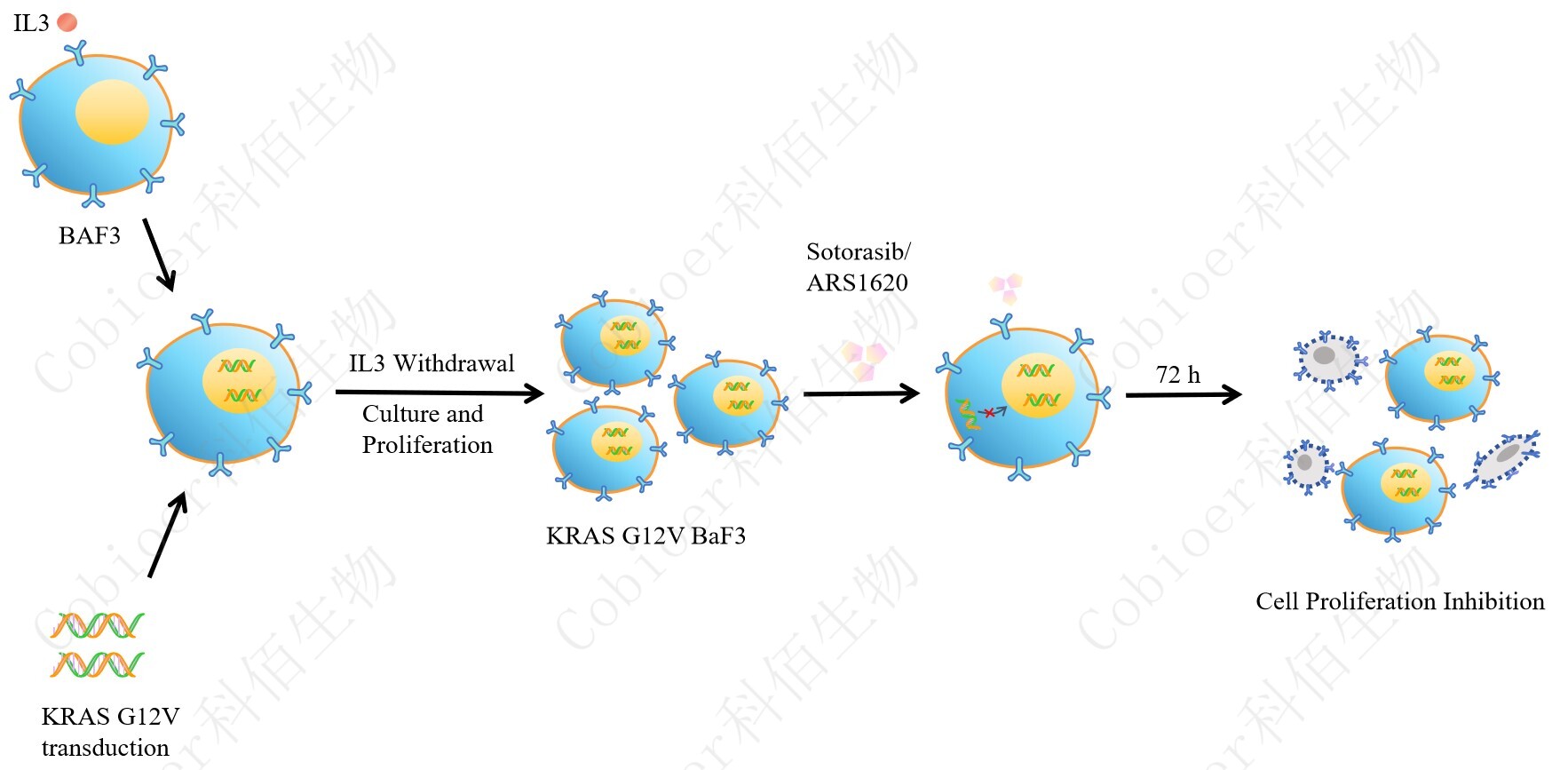 BaF3(小鼠原 B 細胞)的生長和增殖需要 IL-3 的維持。通過引入各種表達激酶的基因, 能作為 BaF3 的驅動基因,讓 BaF3 不再依賴 IL-3 而增殖,進而激酶基因成為 BaF3 增殖依賴的驅動基因,用于評估小分子藥物對激酶的靶向抑制作用,原理及流程見下圖所示。