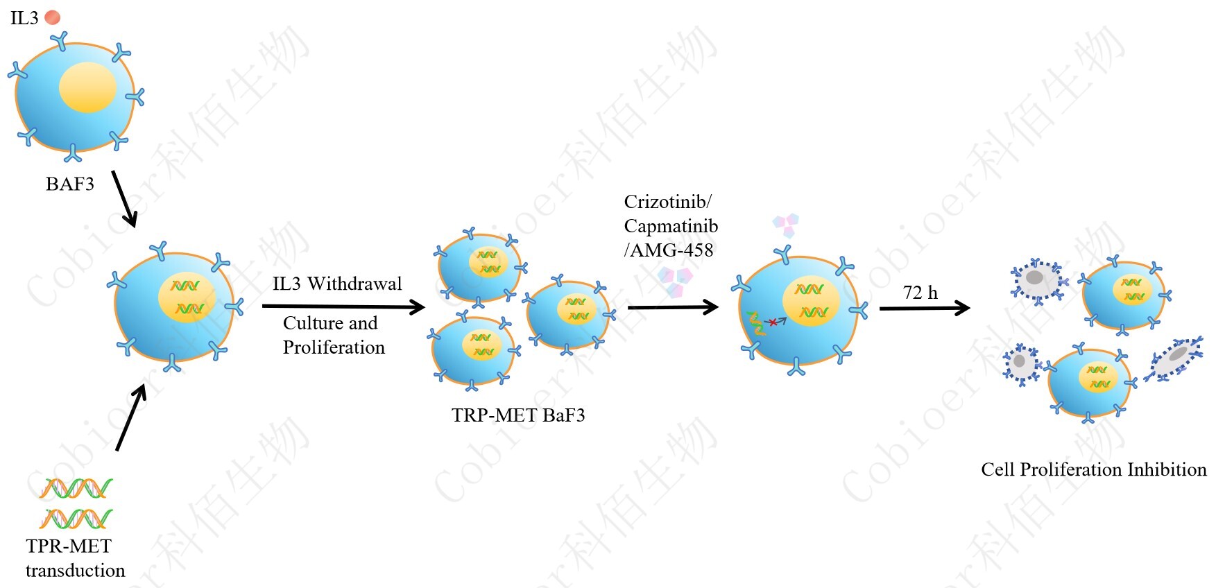 BaF3(小鼠原 B 細胞)的生長和增殖需要 IL-3 的維持。通過引入各種表達激酶的基因, 能作為 BaF3 的驅(qū)動基因,讓 BaF3 不再依賴 IL-3 而增殖,進而激酶基因成為 BaF3 增殖依 賴的驅(qū)動基因,用于評估小分子藥物對激酶的靶向抑制作用,原理及流程見下圖所示。![]() Figure 1. TPR-MET BaF3 細胞的構(gòu)建原理圖 |