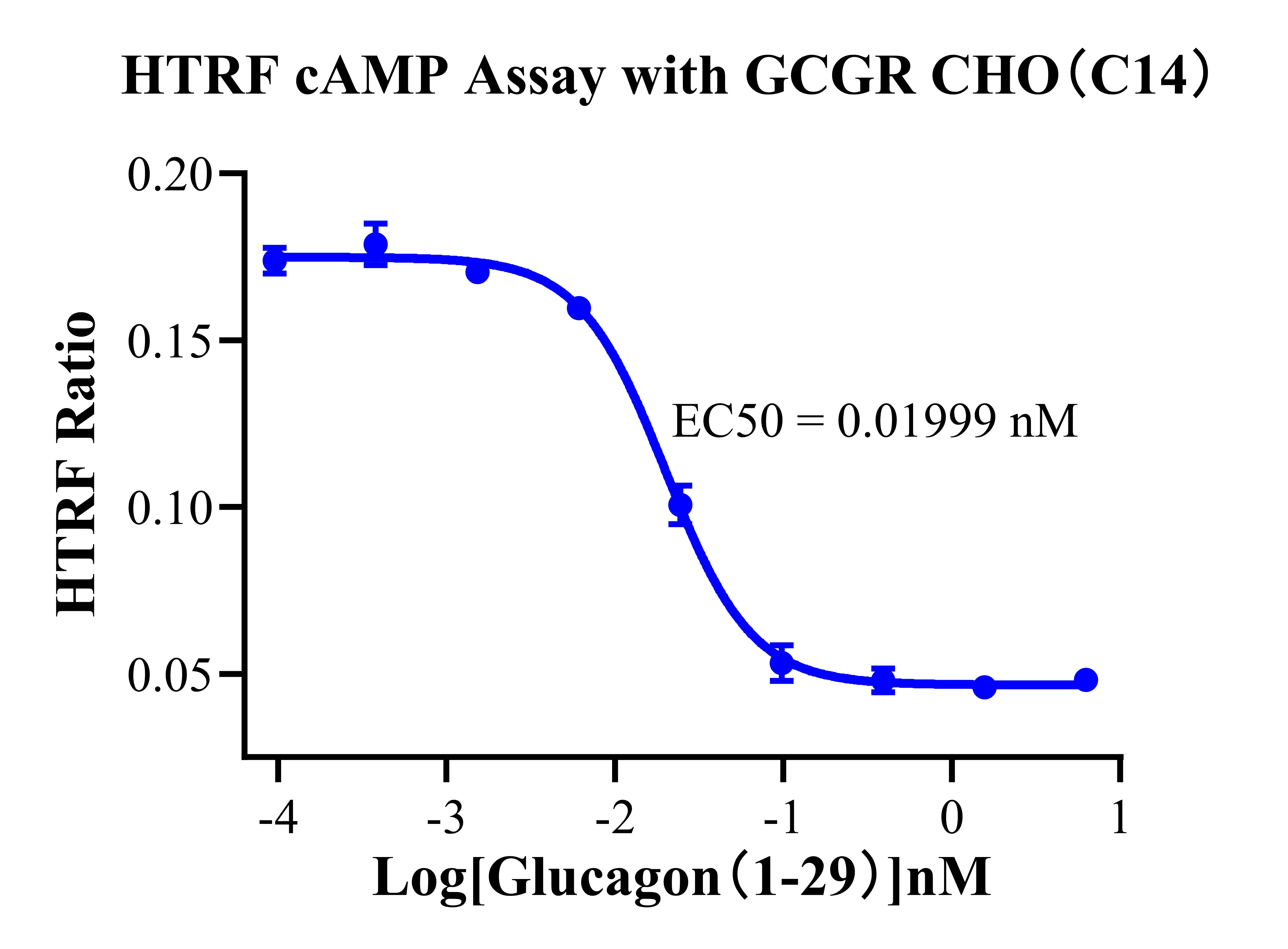 cAMP 在 G 蛋白偶聯(lián)受體(GPCR)信號轉(zhuǎn)導(dǎo)中是一種關(guān)鍵的第二信使。當(dāng)配體結(jié)合到 GPCR,構(gòu)象發(fā)生變化,激活受體接著激活 G 蛋白,Gs 的激活導(dǎo)致腺苷酸環(huán)化酶調(diào)控 cAMP 的升高。GCGR CHO 藥靶模型很好的模擬了體內(nèi) GCGR 的信號轉(zhuǎn)導(dǎo)過程,原理見下圖所示。![]() Figure 1. GCGR CHO 細(xì)胞模型原理圖 |