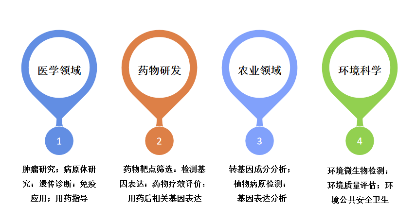 實(shí)時(shí)熒光定量PCR具有靈敏度高、特異性強(qiáng)、快速高效的特點(diǎn),廣泛應(yīng)用于生物醫(yī)藥、臨床診斷、農(nóng)業(yè)、環(huán)境科學(xué)等多個(gè)領(lǐng)域,常用于檢測基因表達(dá)、基因變異、轉(zhuǎn)基因等。