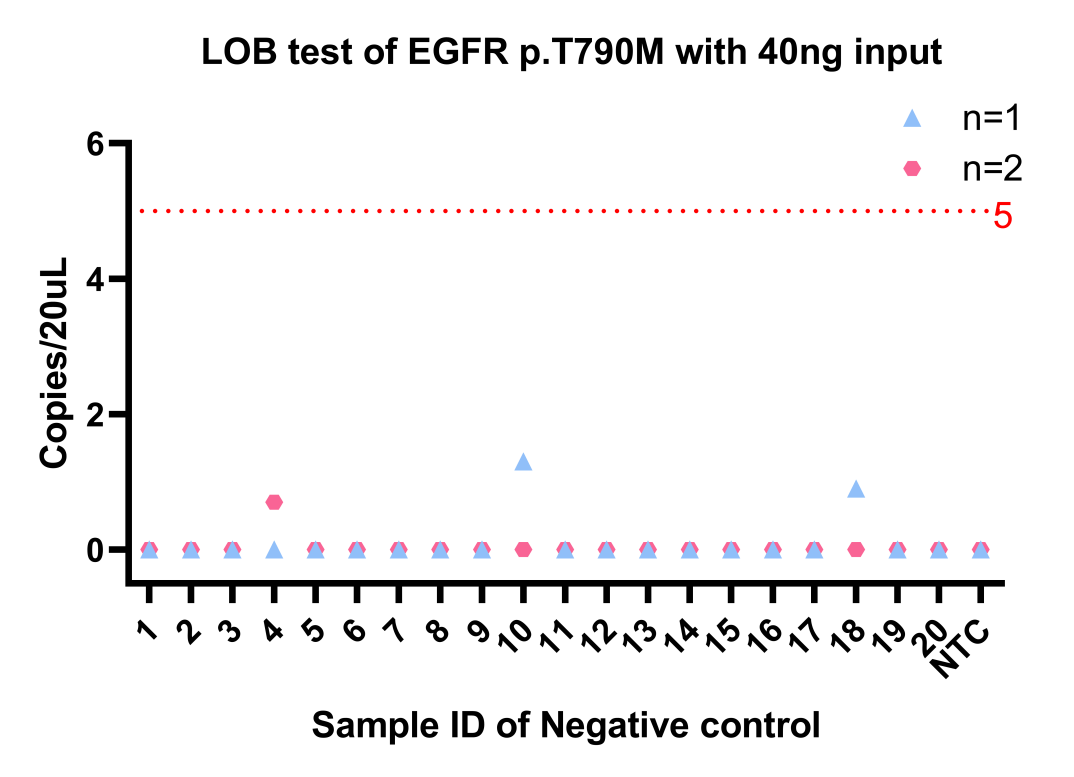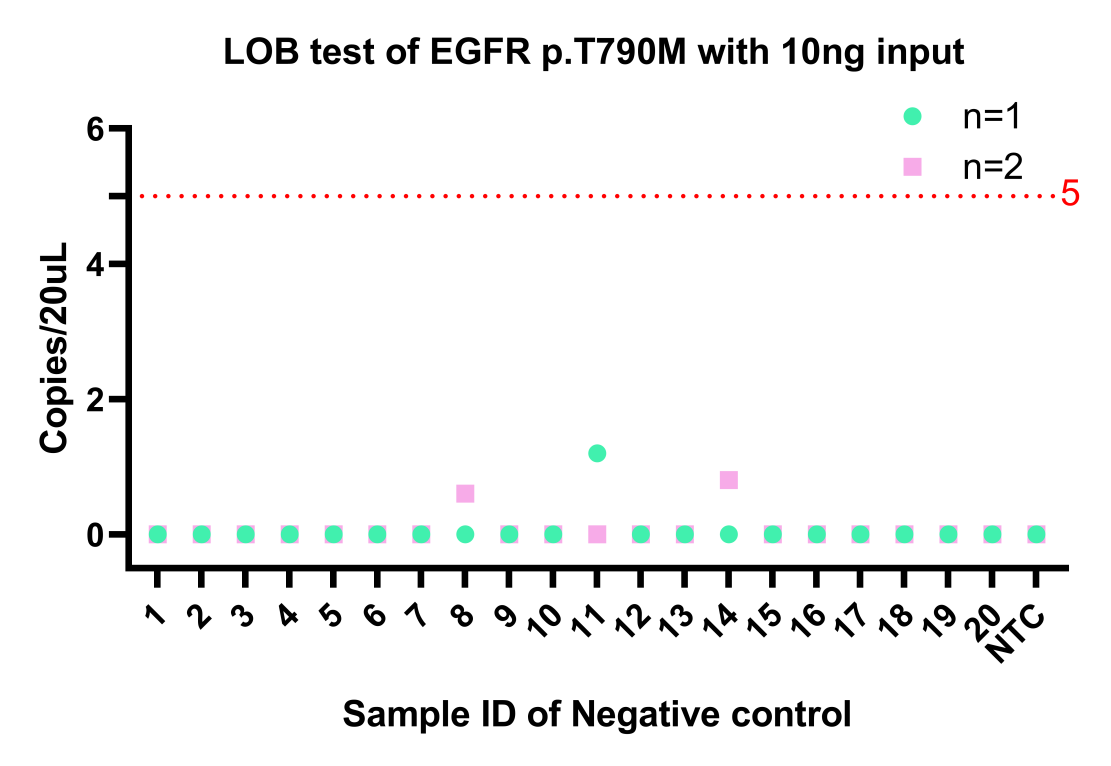 首先使用EGFR T790M的對應(yīng)的陰性標(biāo)準(zhǔn)品,對50%的標(biāo)準(zhǔn)品進行有限稀釋,每個梯度使用陰性樣本兩倍稀釋,接著對11個樣本進行檢測。