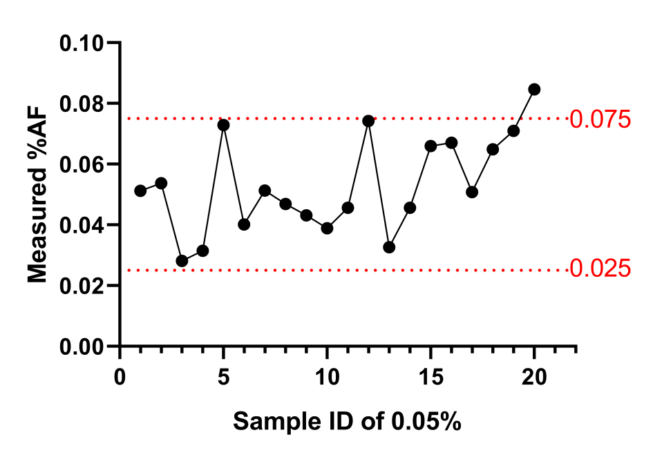 對20個0.05%的樣本進行數(shù)字PCR檢測,觀察在0.025-0.075%以內(nèi)是否達成95%檢出。