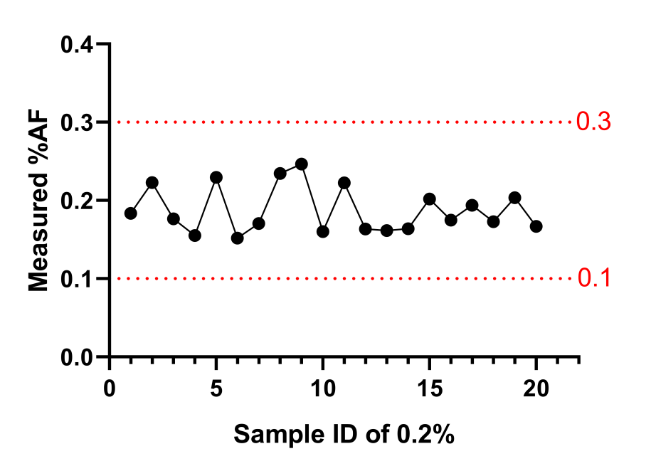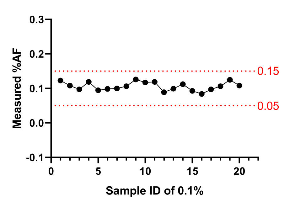 對20個0.1%的樣本進行數(shù)字PCR檢測,觀察在0.05-0.15%以內(nèi)是否達成95%檢出。