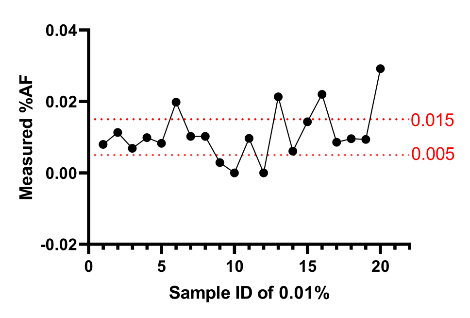 對20個0.01%的樣本進行數(shù)字PCR檢測,觀察在0.005-0.015%以內(nèi)是否達成95%檢出。
