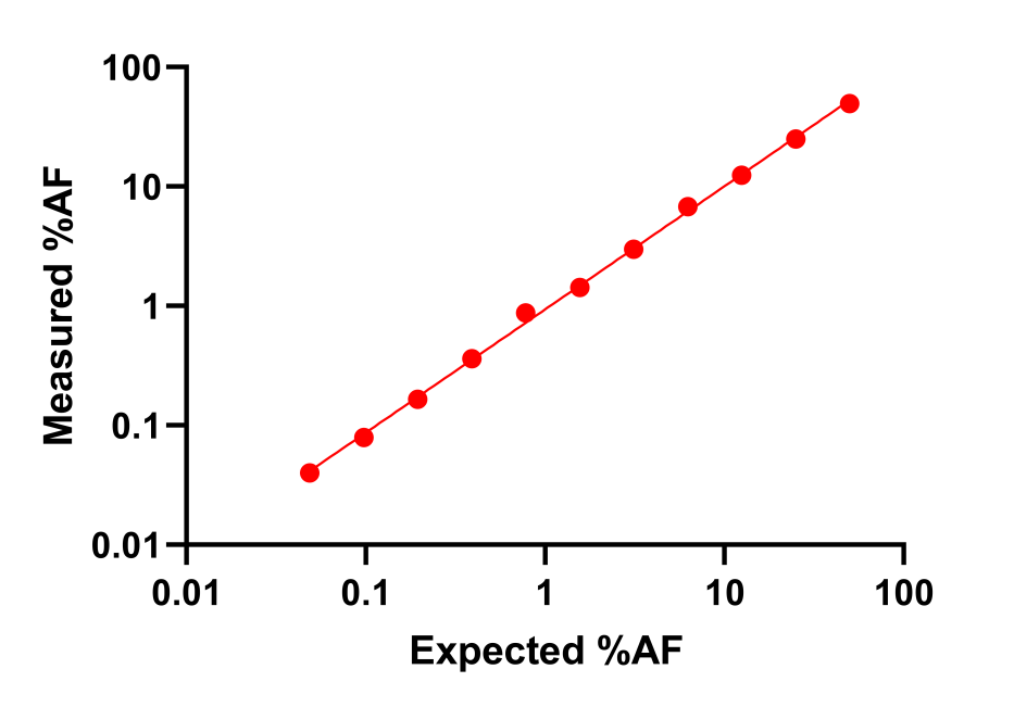 根據(jù)以上結(jié)論,我們選取10ng作為進一步的%AF線性范圍探索,首先使用EGFR T790M的對應(yīng)的陰性標(biāo)準(zhǔn)品,對50%的標(biāo)準(zhǔn)品進行有限稀釋,0.1%-50%間設(shè)置9個AF梯度,進行數(shù)字PCR檢測(2復(fù)孔)。