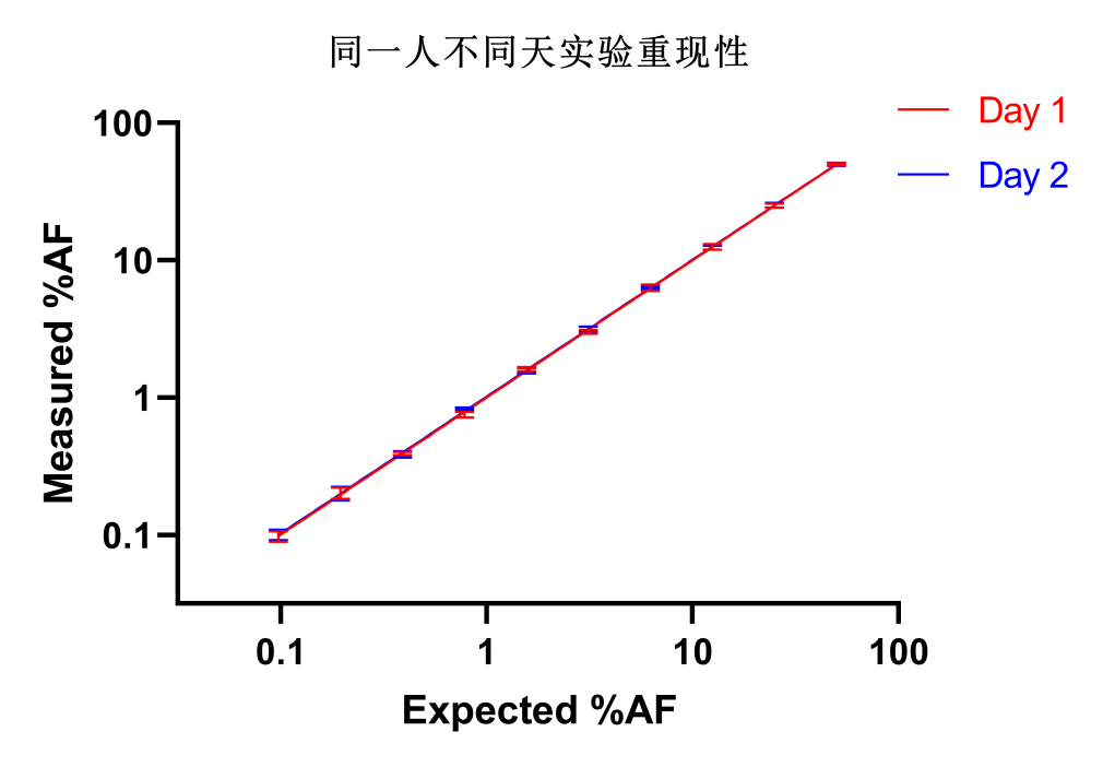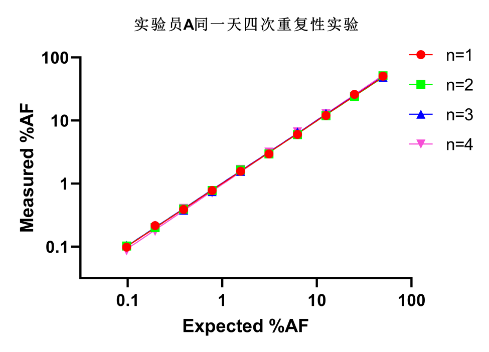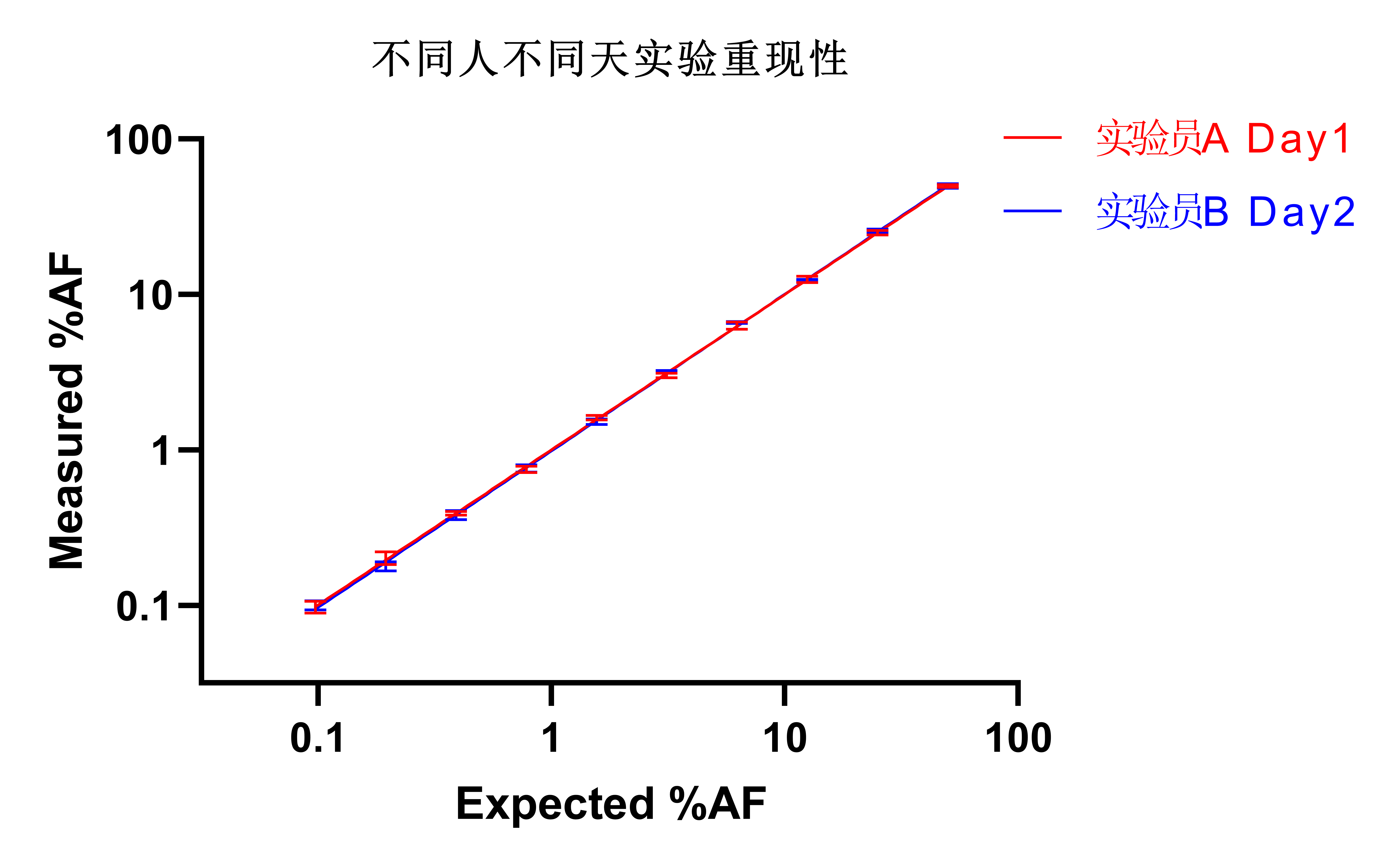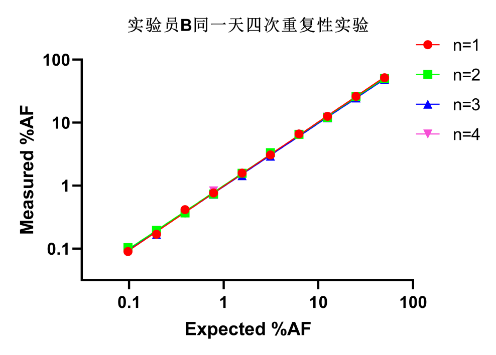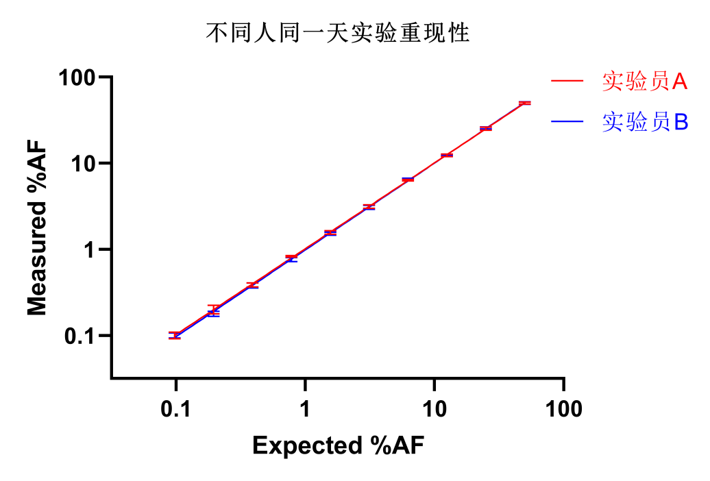 取10個不同AF(1%~50%)的標(biāo)準(zhǔn)品樣本,分別安排實驗員A、實驗員B在同一天,每人進行四次檢測。