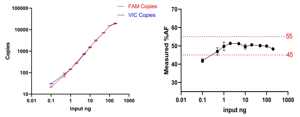 1.2 投入量在0.1ng~200ng間設(shè)置10個梯度,進行數(shù)字PCR檢測(2復(fù)孔),判斷是否滿足%AF=50±10%波動。