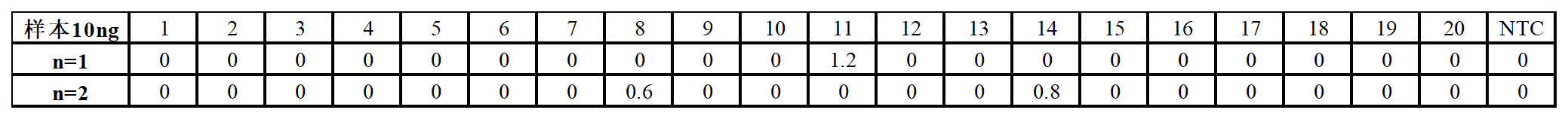 待測樣本:10個NGS驗證為陽性的樣本(編號1-10); 10個NGS驗證為陰性的樣本(編號11-20)。對20個樣本分別使用數(shù)字PCR檢測。