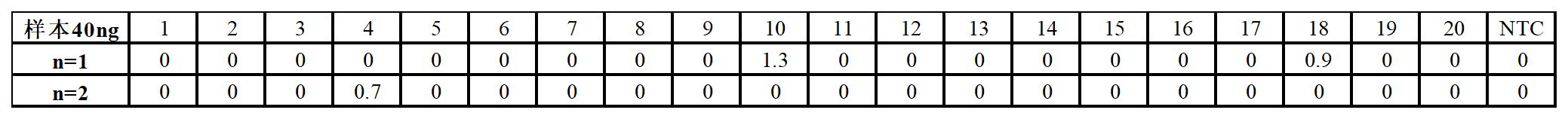 待測樣本:20個陰性樣本和1個NTC。分別將投入量設(shè)置為10ng和40ng,每個樣本做兩個重復(fù)進行Bio-Rad數(shù)字PCR檢測。