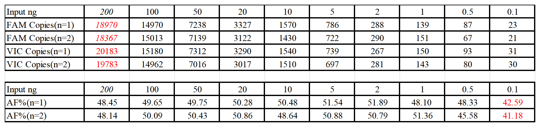 ②0.1 ng投入量過小,拷貝數(shù)不呈現(xiàn)線性,同時42.59%也低于45%,不適合做單一通道,也不適合做雙通道;