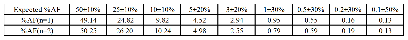 我們可以通過理論計算來預(yù)測下可能的檢測限范圍。當(dāng)控制拷貝在15000(對應(yīng)50ng input)以內(nèi)時LOB數(shù)據(jù)是2,2/15000=0.0133%,預(yù)測檢測限為0.0200%。