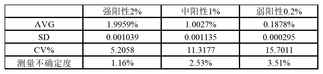 由上數(shù)據(jù)可見:強陽性2% 、中陽性1% 、弱陽性0.2%三種檢測體系下,誤差均在合理的范圍內(nèi),精密度良好。