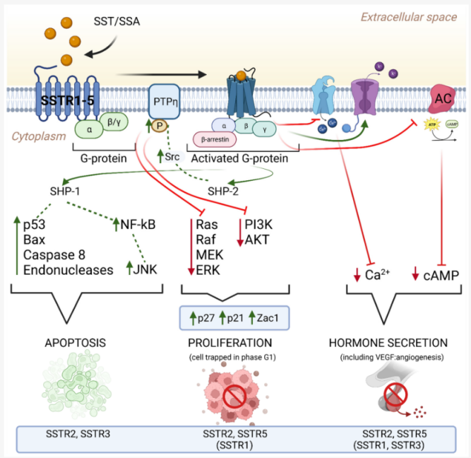SSTR2與其它同家族受體一樣,在結(jié)合內(nèi)源性多肽配體SST后可以與Gi蛋白偶聯(lián),通過調(diào)節(jié)腺苷酸環(huán)化酶活性進而抑制環(huán)腺苷酸的合成,將外源信號傳遞至胞內(nèi),從而參與調(diào)節(jié)多種激素的分泌,抑制細胞生長增殖。SSTR還能激活K+ 通道,促進細胞膜超極化,抑制門控Ca2+通道的激活,進而阻礙Ca2+內(nèi)流,抑制胞吐,抑制荷爾蒙的分泌功能。當SSTR2或其它亞型與SST結(jié)合后,可以通過蛋白酪氨酸磷酸途徑,SSTR導致蛋白酪氨酸磷酸酶(PTP)上調(diào),使酪氨酸激酶去磷酸化而失活,并抑制促絲裂原活化蛋白激酶(MAPK)等多種蛋白激酶,抑制癌基因、c-fos、c-mys、c-jun等轉(zhuǎn)錄激活,從而抑制DNA和蛋白質(zhì)的合成。