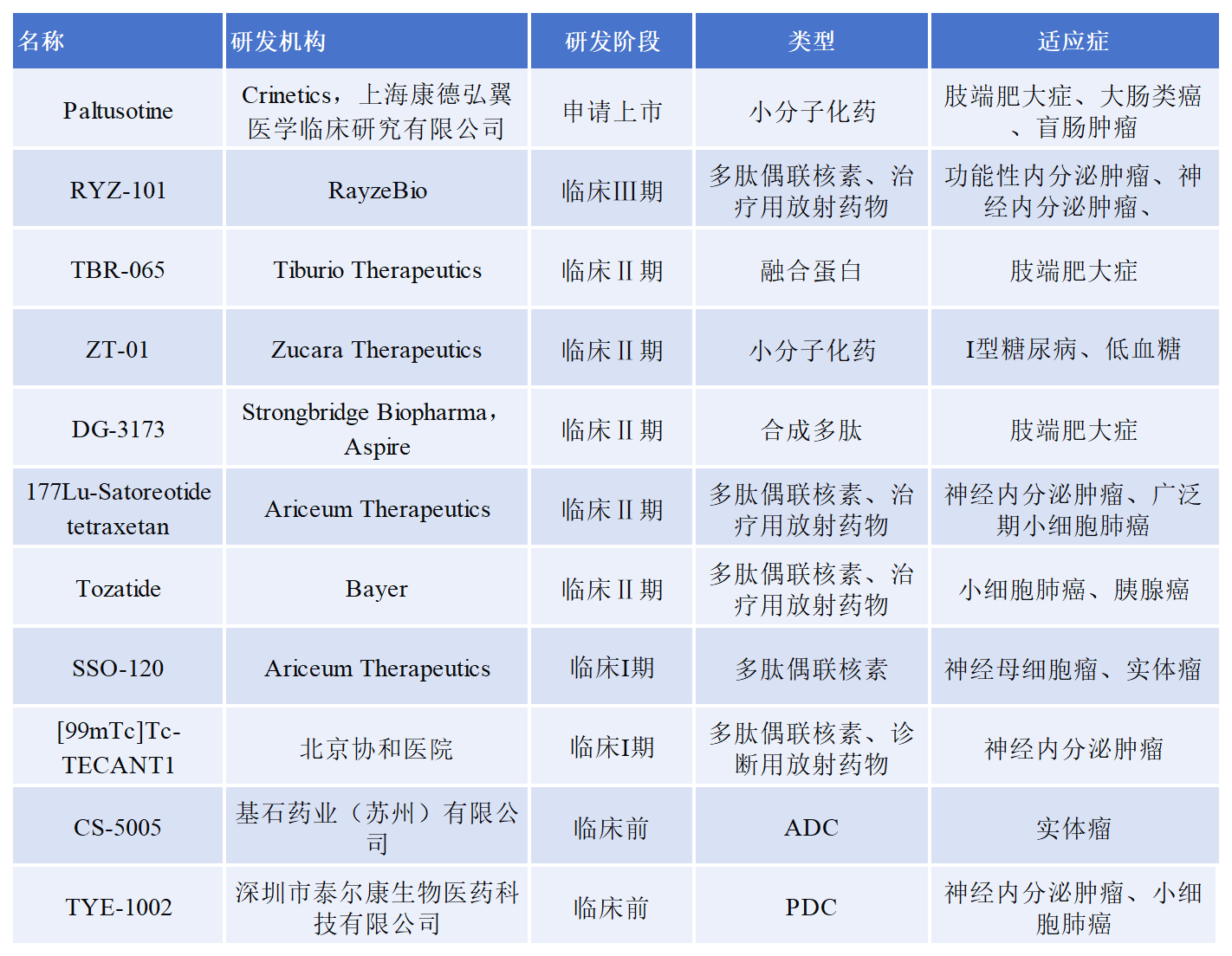 最近,賽諾菲獲得了Zucara Therapeutics公司靶向SSTR2的Ⅰ型糖尿病新藥ZT-01的優(yōu)先談判權(quán)。目前,關(guān)于SSTR2靶點有多種藥物在開發(fā),部分在研藥物進展如下:
