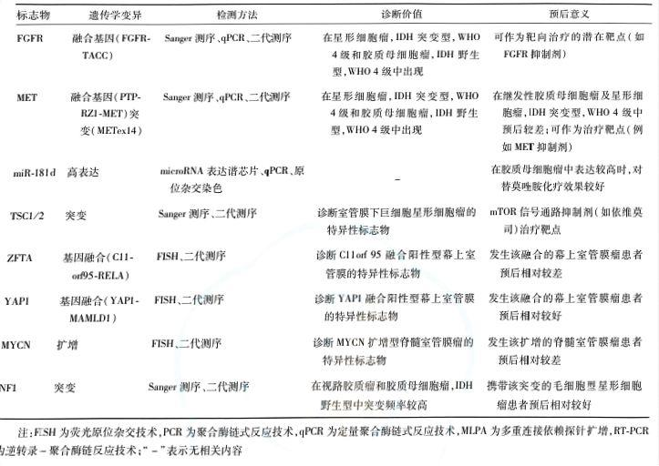 腦膠質(zhì)瘤確診需通過(guò)腫瘤切除術(shù)或活組織檢查術(shù)獲取標(biāo)本,進(jìn)行組織病理學(xué)和分子病理學(xué)整合診斷,以確定病理分級(jí)和分子亞型。分子標(biāo)志物對(duì)腦膠質(zhì)瘤的個(gè)體化治療及臨床預(yù)后判斷具有重要意義。