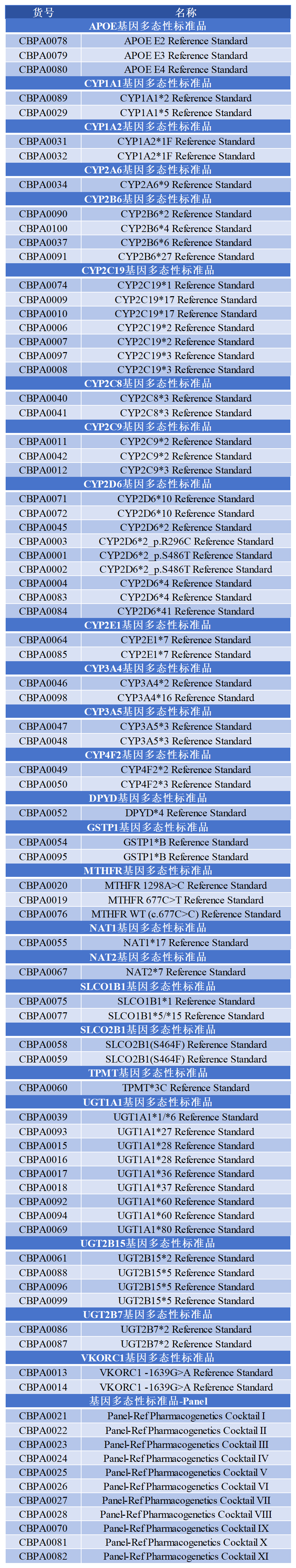 科佰生物目前可提供近百種用藥指導(dǎo)的質(zhì)控單品及混合質(zhì)控盤,涵蓋APOE、CYP1A1、CYP2A6、CYP2B6、CYP2C19、CYP2C8、CYP2C9、CYCP2D6、CYP2E1、CYP3A4、CYP3A5、CYP4F2、DPYD、GSTP1、MTHFR、NAT1、NAT2、SLCO1B1、TPMT、UGT1A1、UGT2B15、UGT2B7、VKORC1等多個藥物代謝基因,可在全流程對檢測過程進行監(jiān)控,幫助實現(xiàn)個體化用藥基因檢測的精準(zhǔn)性。