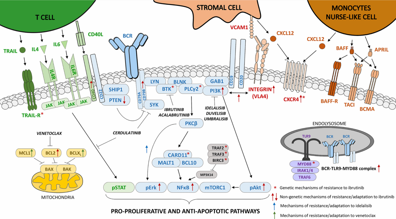 B細胞受體(BCR)信號通路在成熟B細胞惡性腫瘤的發(fā)生和進展中起著核心作用,例如慢性淋巴細胞白血?。–LL)、套細胞淋巴瘤(MCL)、彌漫性大B細胞淋巴瘤(DLBCL)、濾泡性淋巴瘤(FL)或華氏巨球蛋白血癥(WM)。BCR信號通路中的激活突變常見于DLBCL、FL或WM;而在CLL和MCL中一般會缺失,但BCR信號轉(zhuǎn)導被組成性激活,并且是其發(fā)病機制的關(guān)鍵參與者。