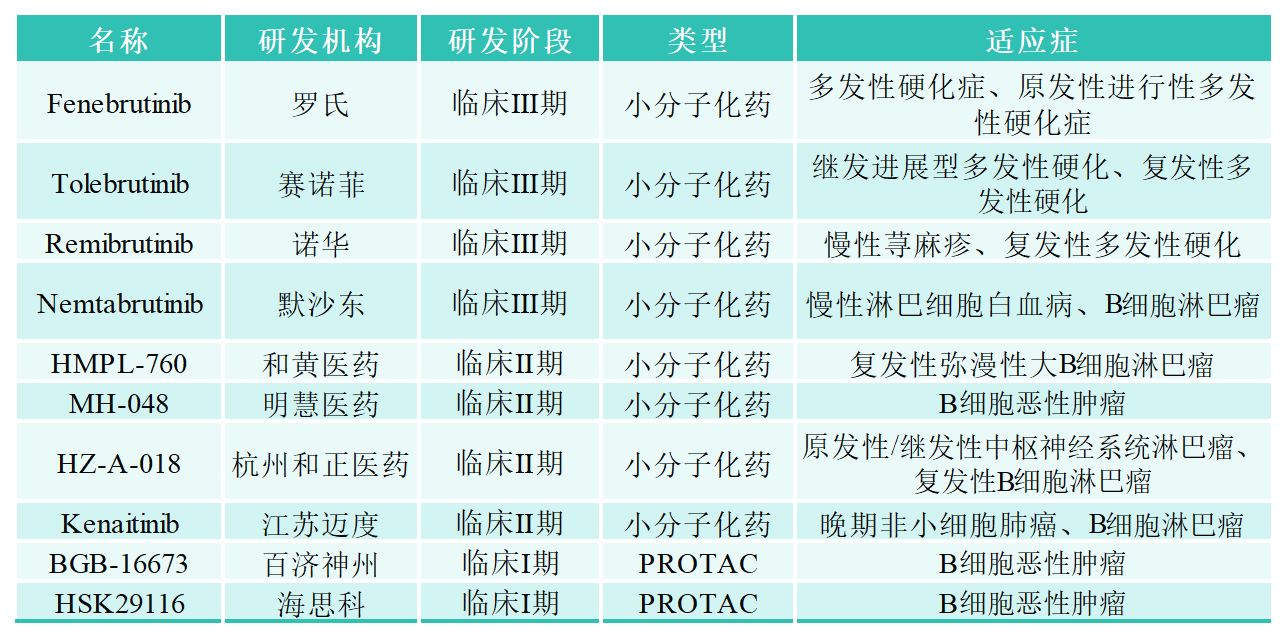 2013年,第一代BTK抑制劑Ibrutinib(伊布替尼)已被批準用于治療 CLL、MCL、WM 和邊緣區(qū)淋巴瘤 (MZL),它與BTK活性位點的半胱氨酸殘基形成共價鍵,封閉了ATP結(jié)合口袋,從而阻斷BTK的酶活性。雖然它是一種強效藥物,但它存在脫靶效應,并且相當多的患者對治療產(chǎn)生耐藥性或毒性而停止治療。第二代的BTK抑制劑(如Acalabrutinib等)在保持高選擇性的同時,減少了脫靶效應,提高了安全性和療效。但第一代和第二代的抑制劑都屬于不可逆抑制劑。BTK共價抑制劑治療后常會產(chǎn)生耐藥,部分耐藥機制為BTK 基因產(chǎn)生耐藥突變導致,其中最常見的耐藥突變?yōu)镃481位的氨基酸突變?yōu)镾。Pirtobrutinib是由禮來研發(fā)的首款獲批上市的非共價的第三代BTK抑制劑,它通過非共價、非C481依賴的結(jié)合阻斷BTK的ATP結(jié)合位點,從而克服由C481S導致的共價BTK抑制劑耐藥機制,另外包括fenebrutinib,Nemtabrutinib等也屬于同一類型的三代非共價抑制劑。除了上述共價或非共價BTK抑制劑外,為了進一步提高藥效和克服耐藥,近年來一些藥企也在開發(fā)針對BTK靶點的PROTAC藥物,下表為部分在研的BTK抑制劑以及PROTAC藥物。