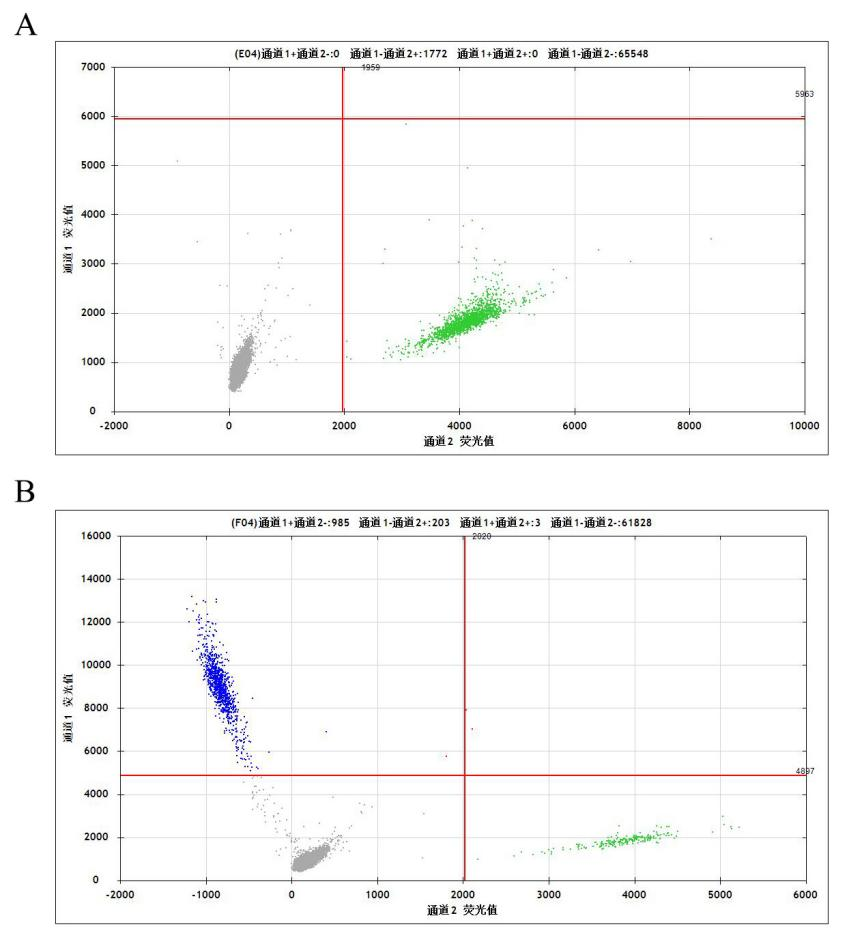 Figure 4:Gene Edited BTK[C481S] Isogenic Cell-ddPCR結(jié)果(通道1 藍色微滴代表BTK C481S 突變陽性,通道2 綠色微滴代表該位點為陰性野生型)