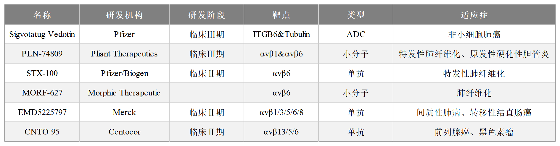 2025年JPM大會(huì)上,Pfizer 公布其Sigvotatug Vedotin(SGN-B6A)在非小細(xì)胞肺癌患者中良好的抗腫瘤活性和初步的療效,特別是在未接受過紫杉烷治療的非鱗狀NSCLC患者中,其療效更為顯著。整合素αvβ6作為纖維化和腫瘤治療的潛力靶點(diǎn),近年來藥物研發(fā)進(jìn)展迅速,涵蓋單抗、小分子、ADC及基因療法等領(lǐng)域。