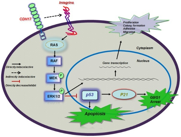 另有研究結(jié)果表明,CDH17間接影響整合素以穩(wěn)定其結(jié)構(gòu)和活性。在人胃癌細胞MGC-803,CDH17過表達能夠激活Ras/Raf/MEK/ERK信號通路,促進細胞在體內(nèi)的致瘤性。