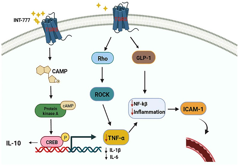 有報(bào)道稱,在慢性炎癥反應(yīng)中,TNF-α可激活多種半胱天冬酶,導(dǎo)致炎癥細(xì)胞凋亡。TGR5已被發(fā)現(xiàn)通過調(diào)節(jié)Rho/Rho相關(guān)蛋白激酶(ROCK)信號通路來調(diào)節(jié)TNF-α。作為TGR5的激動劑,INT-777可以阻斷TNF-α誘導(dǎo)的RMEC增殖和遷移,抑制TNF-α促進(jìn)血管通透性的作用。此外,已有證據(jù)表明,TGR5激動劑可以通過激活TGR5- camp蛋白激酶A (PKA)信號通路,上調(diào)IL-10的表達(dá),發(fā)揮抗炎和免疫抑制作用,降低促炎細(xì)胞因子IL-1β、IL-6和TNF-α的表達(dá)。有研究表明,GLP-1可通過抑制NF-κB延緩ECs的損傷,進(jìn)而抑制IL-1β、IL-6、TNF-α等炎癥因子的分泌。而各種研究證實(shí)GLP-1是TGR5的靶點(diǎn)之一;其分泌依賴于TGR5。因此,推測激活TGR5可能是刺激GLP-1分泌、延緩RMEC損傷的有效途徑。