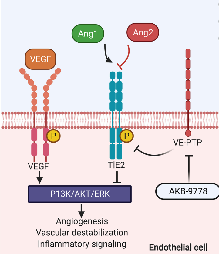 血管生成素蛋白家族由 血管生成素1(Ang1)、血管生成素2(Ang2)、血管生成素3(Ang3) 和血管生成素4(Ang4) 組成。Ang1和Ang2是Tie2的主要配體,Tie2是一種內皮細胞特異性受體酪氨酸激酶。Tie2在血管生成素激活后經(jīng)歷特異性亞細胞定位。這種定位有助于區(qū)分靜止內皮和血管生成內皮之間的信號轉導結果。在運動的血管生成內皮中,基質結合的Ang1與Tie2結合并將其定位于細胞-細胞外基質接觸,并繼續(xù)進行細胞遷移和增殖過程。在靜止內皮中,Ang1/Tie2 信號轉導將匯合內皮細胞上的Tie2轉位到內皮細胞-內皮細胞連接處的簇中,并誘導促存活、內皮緊密連接穩(wěn)定和抗炎信號。這主要是通過下游募集和激活PI3K以及隨后的Akt磷酸化來實現(xiàn)的。Akt信號轉導通過上調促存活分子(包括磷酸化內皮一氧化氮合酶(eNOS) 和存活素表達)來促進內皮細胞存活,同時抑制凋亡途徑,例如 caspase-9 和 B 細胞淋巴瘤 2 (BCL2) 相關細胞死亡激動劑 (BAD)。
