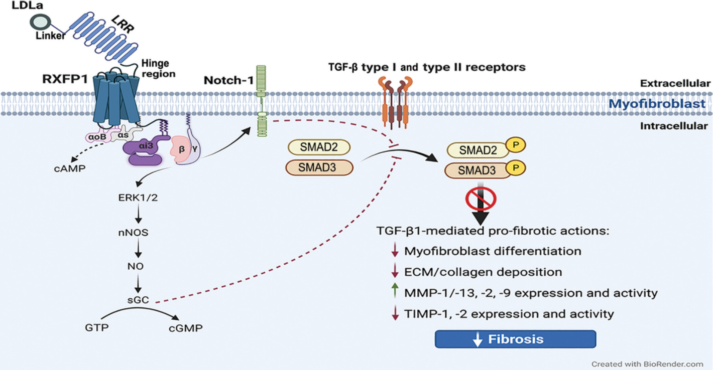 RXFP1 是一種 C 型 LGR 相關(guān) GPCR,含有由多個細(xì)胞外基序組成的約 400 個氨基酸的大細(xì)胞外區(qū)域,包括富含亮氨酸的重復(fù)結(jié)構(gòu)域(LRR)和低密度脂蛋白 A 類 (LDLa) 模塊,它們通過連接子區(qū)域連接。RXFP1在其 LRR 相關(guān)胞外結(jié)構(gòu)域內(nèi)激活,引發(fā)受體的構(gòu)象變化,然后允許其 7TM 結(jié)構(gòu)域的細(xì)胞外環(huán)內(nèi)低親和力結(jié)合位點(diǎn)的相互作用和激活,這由其連接子區(qū)域促進(jìn)。受體的連接子區(qū)域在配體結(jié)合時穩(wěn)定受體構(gòu)象方面起著關(guān)鍵作用,并將殘基定位在連接子區(qū)域和 LDLa 模塊內(nèi)以與 7TM 結(jié)構(gòu)域結(jié)合并激活受體。然后,該作用使 LDLa 模塊能夠充當(dāng)系留激動劑,并在配體結(jié)合時引導(dǎo)受體信號傳導(dǎo)。位于 RXFP1 C 末端的鉸鏈區(qū)域在受體激活時也會發(fā)生構(gòu)象和增加暴露,以誘導(dǎo) G 蛋白 (Gαs, GαOB, Gαi3和 Gβγ) 活動。在肌成纖維細(xì)胞中,這導(dǎo)致 cAMP 短暫升高,但 pERK1/2 增加更持久,nNOS-NO-sGC-cGMP 活性因 RXFP1-ERK1/2 依賴性增加。RXFP1-pERK1/2-nNOS-NO-sGC-cGMP 依賴性途徑的激活或肌成纖維細(xì)胞直接激活 cGMP 然后抑制 SMAD2 和 SMAD3 水平的 TGF-β1 信號轉(zhuǎn)導(dǎo),從而抑制 TGF-β1 促進(jìn)肌成纖維細(xì)胞分化和肌成纖維細(xì)胞誘導(dǎo)的 ECM/膠原蛋白合成和沉積的能力。RXFP1 激活還可以調(diào)節(jié) Notch-1 依賴性信號傳導(dǎo),以抑制肌成纖維細(xì)胞中的 TGF-β1/SMAD3 軸。此外,RXFP1-pERK1/2-nNOS-NO-sGC-cGMP依賴性途徑的激活導(dǎo)致ECM降解MMP的表達(dá)和活性增加(當(dāng)TGF-β1活性上調(diào)時通常受到抑制),以及TIMP的活性降低,這將促進(jìn)MMP誘導(dǎo)的已建立ECM/膠原沉積的分解,并有助于減少纖維化進(jìn)展。