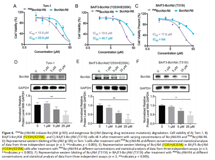 科佰生物為客戶提供了BCR-ABL1 [Y253H/E255K]/BaF3(貨號(hào)CBP73326)和BCR-ABL1 [T315I]/BaF3(貨號(hào)CBP73190)產(chǎn)品,幫助客戶在細(xì)胞活性測(cè)定中對(duì)其細(xì)胞活力測(cè)定,判斷PMIBcr/Abl-R6對(duì)細(xì)胞的殺傷能力和降解能力,通過(guò)對(duì)不同濃度的PMIBcr/Abl-R6處理的細(xì)胞系代表性蛋白印跡的測(cè)定與分析,從而助力研究過(guò)程中PMIBcr/Abl-R6誘導(dǎo)Bcr/Abl p185和外源性表達(dá)的Bcr/Abl攜帶耐藥性突變。