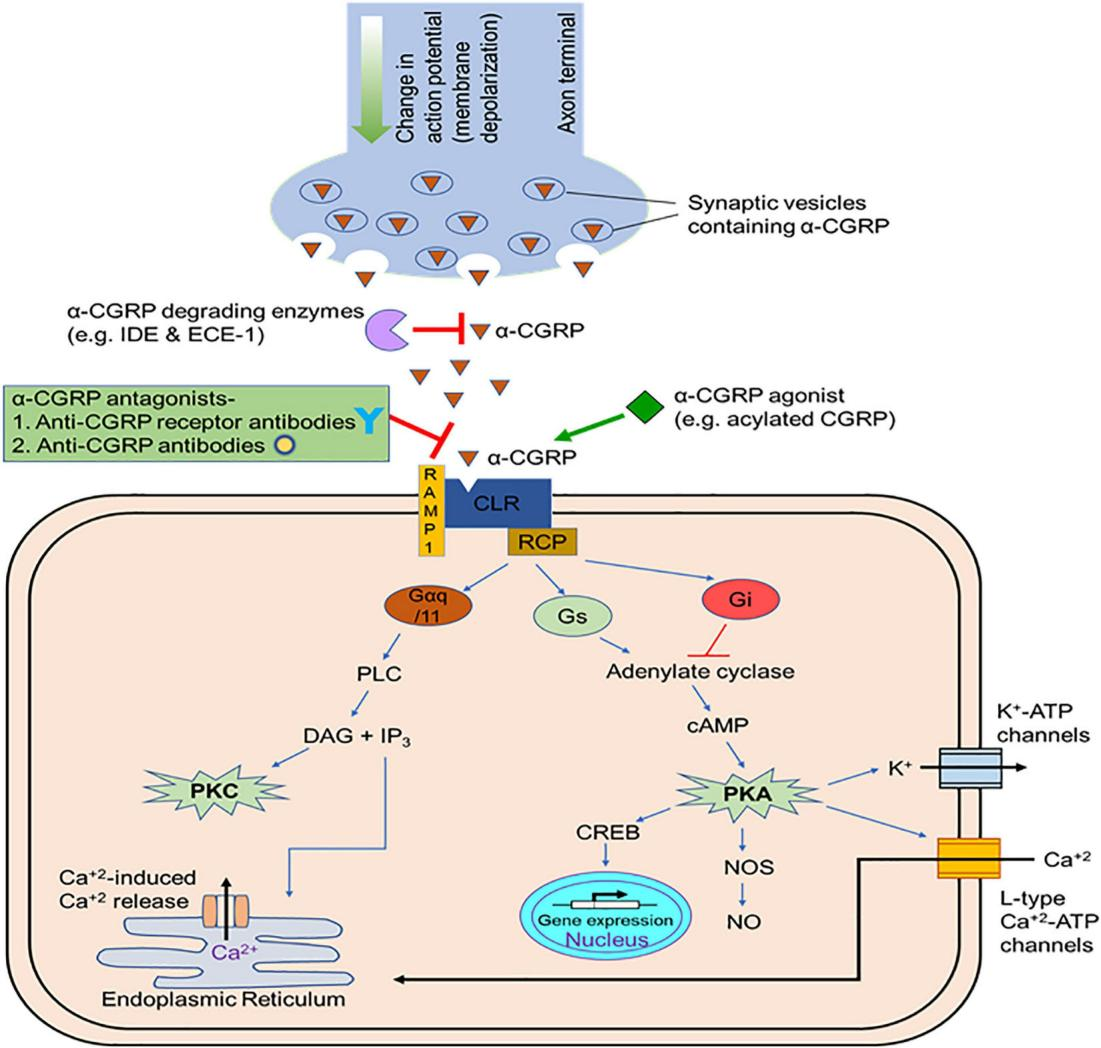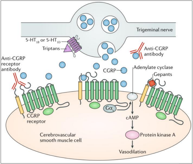 降鈣素基因相關(guān)肽(calcitonin gene-related peptid,CGRP)是一個含有37個氨基酸殘基的感覺神經(jīng)源性多肽,分為α-CGRP和β-CGRP兩個亞型,廣泛分布于中樞神經(jīng)系統(tǒng)(主要是三叉神經(jīng)血管系統(tǒng)、丘腦和小腦)。CGRP是一種強效的血管擴張劑,它主要由感覺神經(jīng)(如三叉神經(jīng))釋放。CGRP釋放后與腦血管平滑肌細(xì)胞表面的CGRP受體結(jié)合,引起腦血管擴張。CGRP受體的結(jié)構(gòu)主要包括:降鈣素受體樣受體(CALCRL)、活性修飾蛋白受體(RAMP)及結(jié)構(gòu)蛋白受體(RCP)。CGRP受體復(fù)合物是一種G蛋白偶聯(lián)受體,通過激活蛋白激酶A系統(tǒng),參與疼痛信息的病理調(diào)控過程。