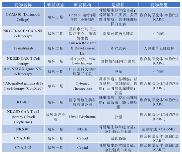 截至目前,全球有11種針對NKG2D的在研藥物,主要集中在臨床早期,其中以CAR-T細胞療法為作用機制的就有10種。而CAR-NK療法因為沒有發(fā)現細胞因子釋放綜合癥及神經毒性等副作用,因而比CAR-T療法具有優(yōu)勢,這可能是由于NK細胞本身不容易導致過高的細胞因子分泌。除此之外CAR-NK療法不需要以患者的自體免疫細胞作為來源、治療成本更低等優(yōu)勢可能使它成為CAR-T療法的一大競爭對手。除抗腫瘤藥物外,強生旗下的楊森公司針對該靶點在自身免疫疾病方面的作用開發(fā)了一款單抗類藥物,通過抑制該靶點活性來降低克羅恩病患者的炎癥反應。