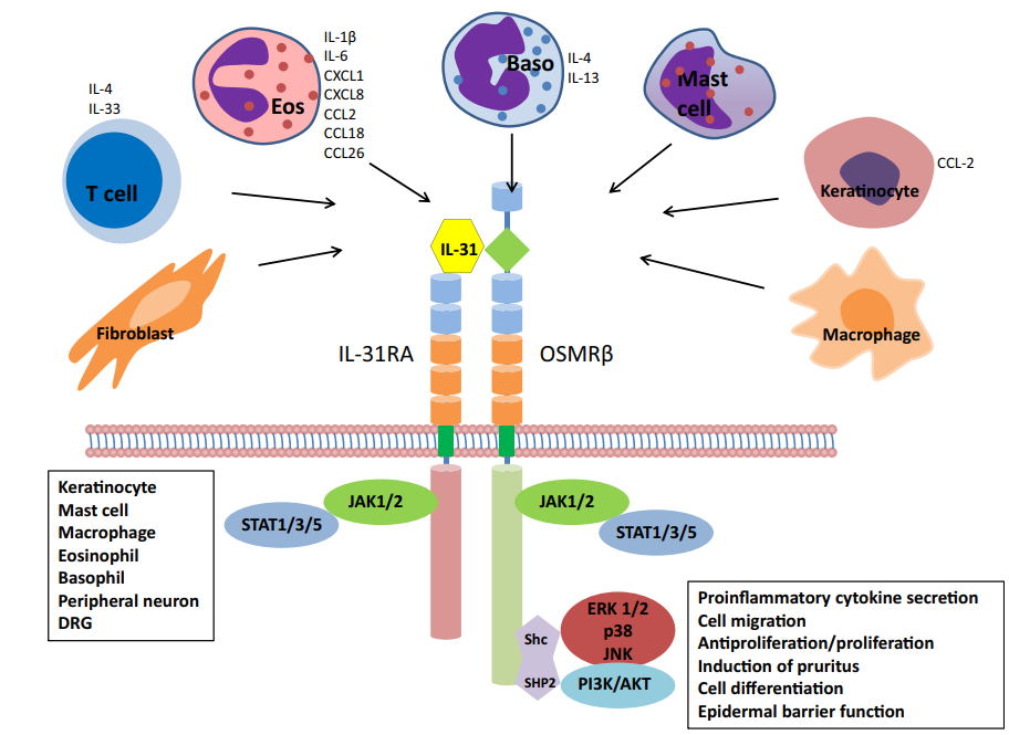 IL-31(白細(xì)胞介素31)于2004年被Dillon等人發(fā)現(xiàn),是一種四螺旋束細(xì)胞因子,有2個(gè)長(zhǎng)螺旋和2個(gè)短螺旋,屬于糖蛋白130 (gp130)/IL-6細(xì)胞因子家族。IL-31最初被證明是由激活的輔助T細(xì)胞產(chǎn)生的,尤其是Th2細(xì)胞、肥大細(xì)胞、巨噬細(xì)胞和樹突狀細(xì)胞,此外在嗜酸性粒細(xì)胞、嗜堿性細(xì)胞等中也有IL-31的表達(dá)。IL-31與瘙癢感覺(jué)神經(jīng)纖維表面IL-31RA亞基結(jié)合,激活OSMR亞基發(fā)生異構(gòu),主要通過(guò)磷脂酰肌醇30-激酶/蛋白激酶(PI3K/AKT)通路、Janus激酶/信號(hào)轉(zhuǎn)換器和轉(zhuǎn)錄激活因子(JAK/STAT)通路及絲裂原激活的蛋白激酶(Ras/Raf/MAPK)通路。IL-31信號(hào)通路的下游轉(zhuǎn)錄因子的激活會(huì)參與不同的基因表達(dá),比如炎癥、遷移、分化、(抗)增殖、細(xì)胞存活和屏障功能等。