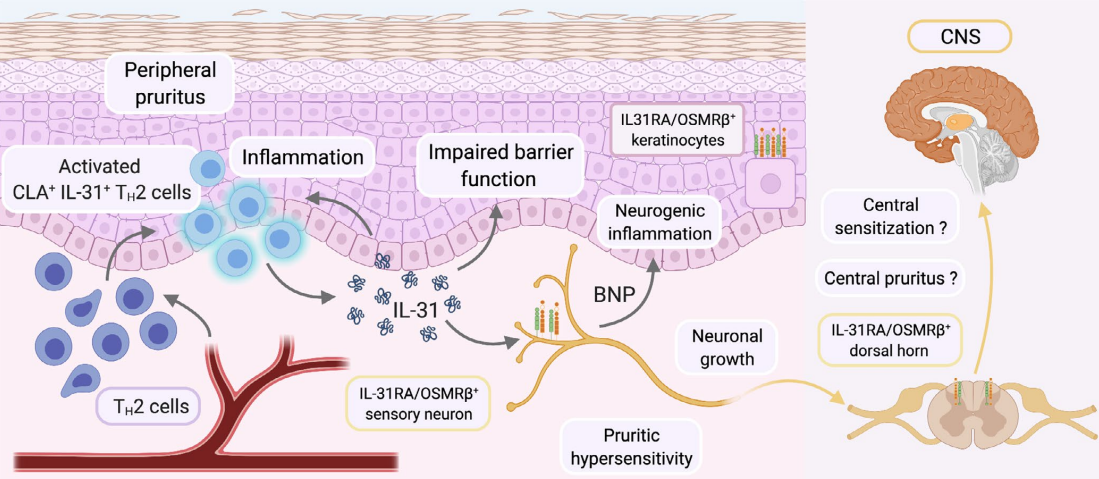 CLA T2細(xì)胞是特應(yīng)性皮炎(AD)患者循環(huán)中豐富的過(guò)敏原反應(yīng)性T細(xì)胞,通過(guò)CCL17和CCL22信號(hào)被募集到AD感染的皮膚。在皮膚中,CLA T2細(xì)胞分泌IL-31,進(jìn)而激活表達(dá)IL31RA/ OSMR β-的皮膚感覺(jué)神經(jīng)、天然免疫細(xì)胞(包括DC)、單核細(xì)胞和嗜酸性粒細(xì)胞以及角質(zhì)形成細(xì)胞。在AD皮膚中,角質(zhì)形成細(xì)胞顯示IL31RA/OSMRβ表達(dá)水平升高,導(dǎo)致對(duì)IL-31的接受性增強(qiáng)。皮膚IL-31信號(hào)通過(guò)IL-31介導(dǎo)的終分化基因(如聚絲蛋白和脂質(zhì)包膜減少)的抑制,導(dǎo)致外周瘙癢、(神經(jīng))炎癥和屏障功能受損?;罨慕琴|(zhì)形成細(xì)胞分泌各種化學(xué)引誘劑,觸發(fā)表達(dá)IL -31的CLA Tu2細(xì)胞額外募集到炎癥部位,形成皮膚炎癥和瘙癢的反饋循環(huán)。人和犬的感覺(jué)神經(jīng)元表達(dá)IL31RA/ OSMRβ主要在TRPV1共表達(dá)的神經(jīng)元中。IL-31與IL31RA/ OSMR β結(jié)合后,通過(guò)下游信號(hào)通路上調(diào)瞬時(shí)受體電位香草酸受體1(tansient receptor potential vanilloid,TRPV1)及瞬時(shí)受體電位受體A1(TRPA1)表達(dá),增強(qiáng)神經(jīng)元興奮性,促進(jìn)晚期及慢性瘙癢形成。