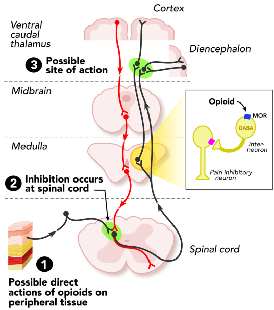 阿片受體在疼痛調(diào)節(jié)下行通路中表達,其中包括髓質藍斑和導水管周圍灰色區(qū)。它們也在大腦邊緣,中腦和皮質結構。