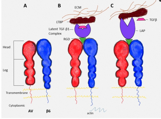 整合素αvβ6特異的配體主要配體包括細(xì)胞外基質(zhì)蛋白如纖維連接蛋白(Fibronectin)、層粘連蛋白(Laminin)以及潛活形式的TGF-β。潛伏期相關(guān)肽(LAP)是轉(zhuǎn)化生長(zhǎng)因子β(TGF-β)前體肽的氨基末端結(jié)構(gòu)域,形成潛在的 TGF-β 復(fù)合物,并充當(dāng)整合素 αvβ6 的配體。當(dāng)整合素 αvβ6 通過(guò)LAP與細(xì)胞外位點(diǎn)的潛在TGF-β復(fù)合物結(jié)合時(shí),同時(shí)與細(xì)胞內(nèi)細(xì)胞骨架結(jié)合時(shí),活性TGF-β從潛在復(fù)合物中釋放出來(lái),驅(qū)動(dòng)纖維化和免疫抑制微環(huán)境形成;此外,αvβ6還可作為口蹄疫病毒(FMDV)等病原體的入侵受體。
