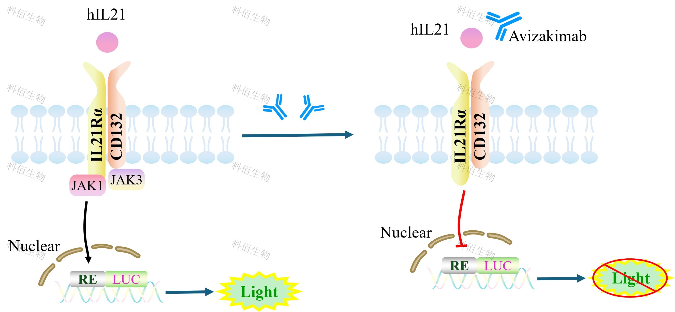 IL21 Effector Reporter Cell 報告基因藥靶模型很好的模擬了體內(nèi) IL21 的信號轉(zhuǎn)導過程, 原理見下圖所示。![]() Figure 1. IL21 Effector Reporter Cell 模型原理圖 |