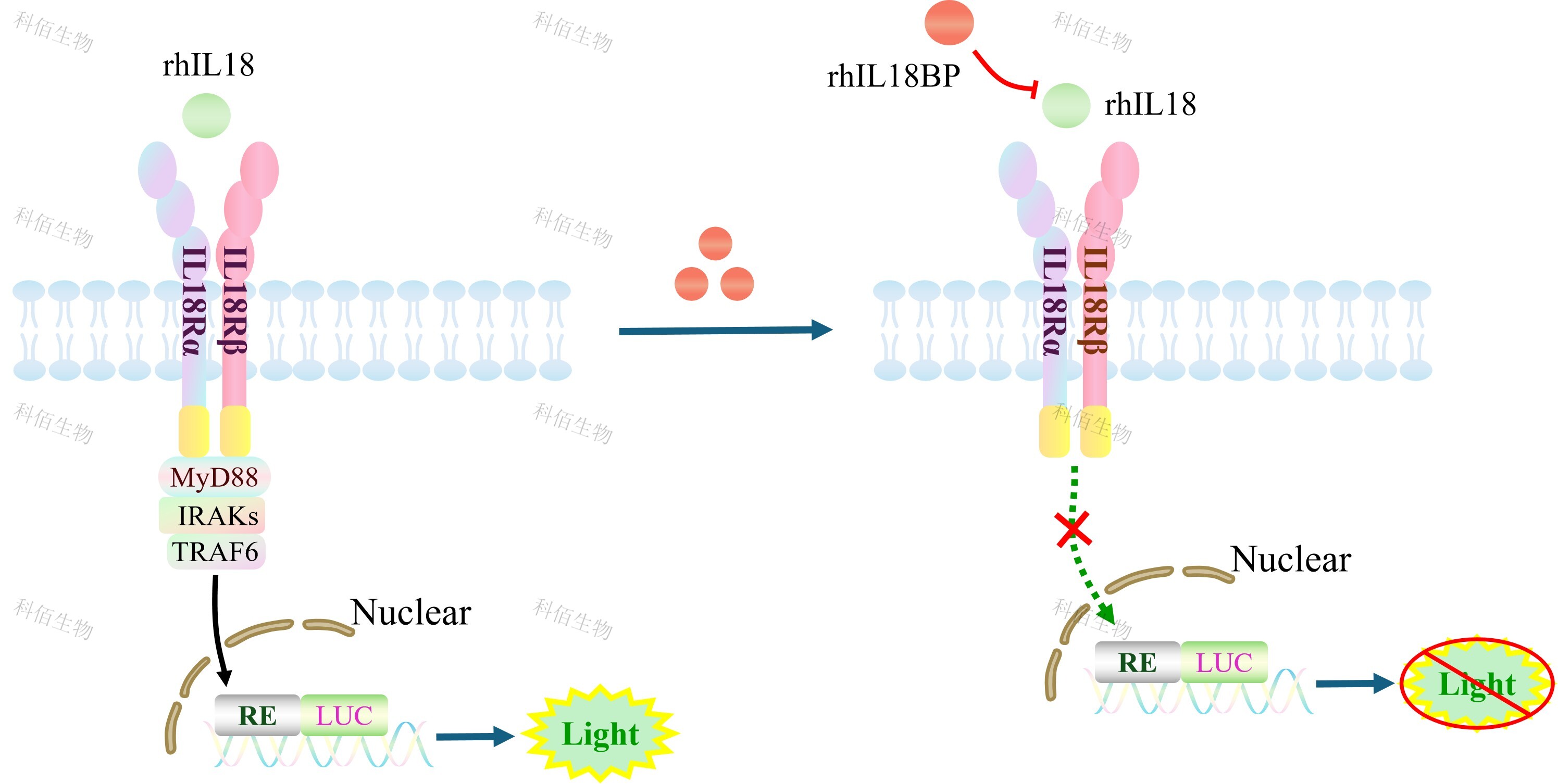 | IL18 Effector Reporter Cell(Suspension),在由調(diào)控因子調(diào)控并表達(dá)報告基因的重組細(xì)胞上,穩(wěn)定表達(dá)人 IL18Rα和人 IL18Rβ。 報告基因細(xì)胞模型可以很好的反映分子作用機(jī)制,同時具備更小的變異性和更好的可 操作性,已被中檢院及藥企廣泛應(yīng)用于抗體藥物生物活性的檢定,對于藥物研發(fā)、質(zhì)量控 制、批次放行都有重要意義。 IL18 Effector Reporter Cell(Suspension)報告基因藥靶模型很好的模擬了體內(nèi) IL18 的信號轉(zhuǎn)導(dǎo)過程,原理見下圖所示。 ![]() Figure 1. IL18 Effector Reporter Cell(Suspension)細(xì)胞模型原理圖 |