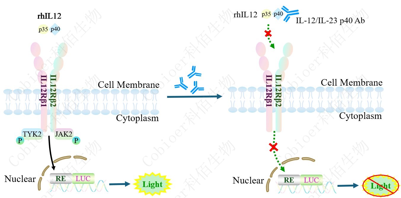 IL12 Effector Reporter Cell 報告基因藥靶模型很好的模擬了體內(nèi) IL12 的信號轉導過程, 原理見下圖所示。 ![]() Figure 1. IL12 Effector Reporter Cell 細胞模型原理圖 |
